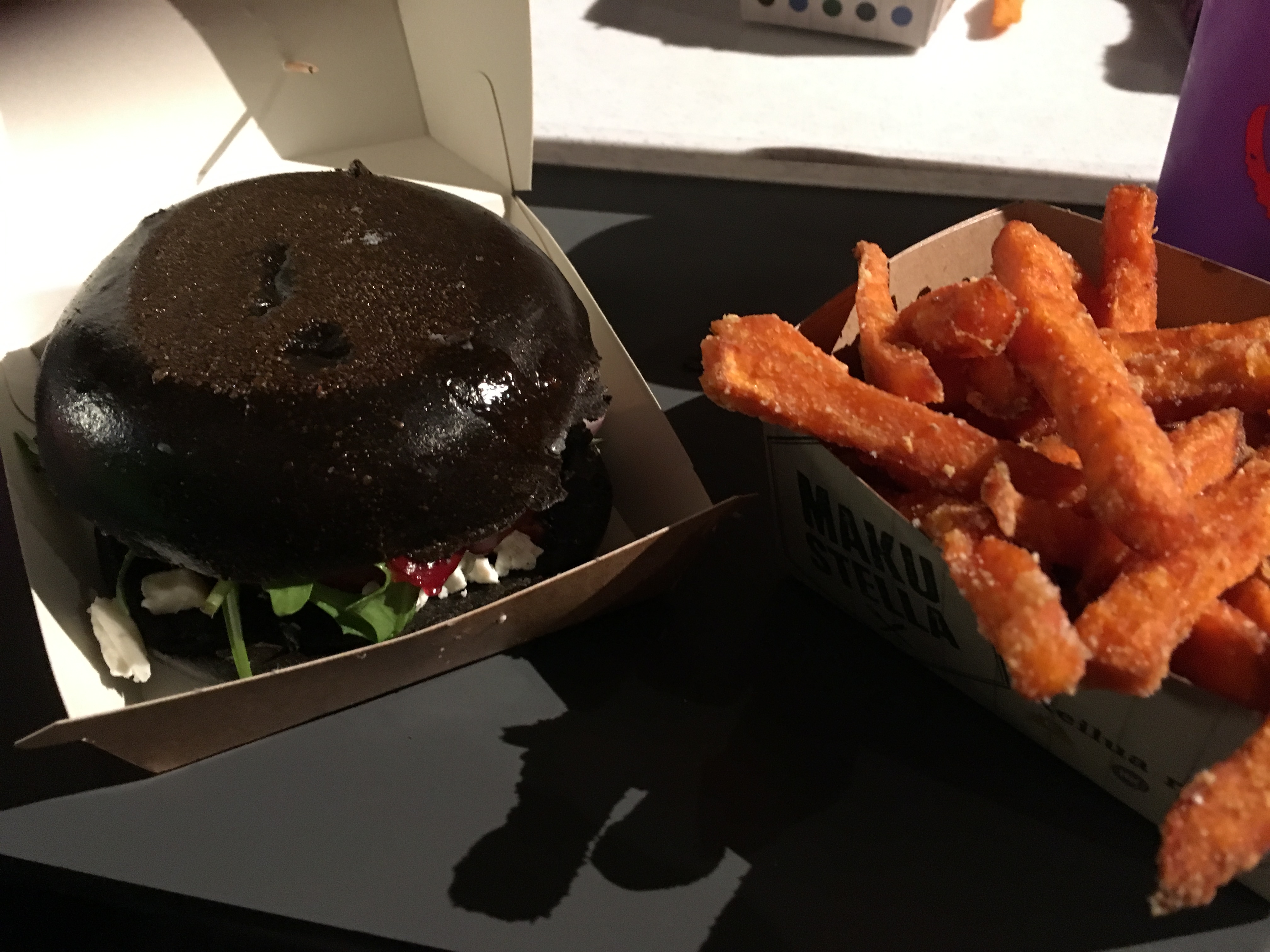 Väistelimme Zombeja ja kävimme ihanassa auringonlaskussa Tyrskyssä ja Troikassa. Oli ihanaa nähdä pimeä ja valaistu Tampere laitteiden huipulta, kun kirpeä syystuuli osuu kasvoihin. Kokeilimme poikaystäväni kanssa uutuuslaitetta Hypeä, joka on Särkänniemen nopein ja korkein laite. Tuli huudettua! Kävimme syömässä X-BRGRissa, ja Lihattomalla kun olemme, valitsimme kasvishampurilaiset ja bataattiranskalaiset. Kaikki hampurilaiset oliva teeman mukaisesti mustia, mikä nosti pisteitä tapahtumaan panostamisesta. Välissä oli bataattikiekko, vuohenjuustoa ja hilloa sekä kasviksia. Hyvää oli!