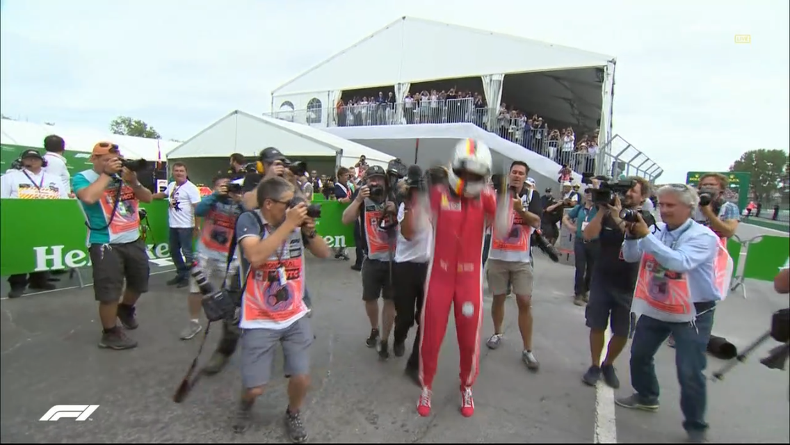 Kierroksella 42 Alonsoa pyydetään palaamaan tallille ja keskeyttämään kilpailu alentuneen suorituskyvyn ja vioittuneen pakoputken vuoksi. Kärjessä ajetaan letkassa, ja Bottaksen ero Vetteliin on noin 5 sekuntia. Ricciardo jää jälkeen tallikaveristaan. Jos maaliin tullaan näillä sijoituksilla, Vettel nousee mestaruustaistelun kärkeen yhden pisteen turvin. Kierroksella 56 Bottas tekee pienen ajovirheen ohittaessaan kierroksella Sainzia, joka on sijalla 8. Samalla kierroksella Vettelin kanssa ovat enää hänestä seuraavat 5 autoa. Vettelin ja Bottaksen välillä on 8 sekuntia, joten Vettelin voitto alkaa näyttää varmalta, kun ajettavia kierroksia on enää 10 jäljellä. Hamilton ottaa autostaan kaiken irti taistellessaan Ricciardon kanssa sijasta 4, kun taas Vettel ajaa rauhallisesti uransa 50. voitosta, joka häämöttää vain 4 kierroksen päässä. Järjestäjät mokaavat, kun ruutulippua heilutetaan kierrosta liian aikaisin. Onneksi kuljettajat ovat perillä tilanteesta ja eivät anna virheen häiritä. Maaliin saavutaan järjestyksessä 1. Vettel, 2. Bottas, 3. Verstappen, 4. Ricciardo ja 5. Hamilton, ja Vettel ottaa 50. voittonsa ja johdon maailmanmestaruustaistossa. Ferrari on voittanut Montrealissa viimeksi 2004, joten edessä on voiton juhla!