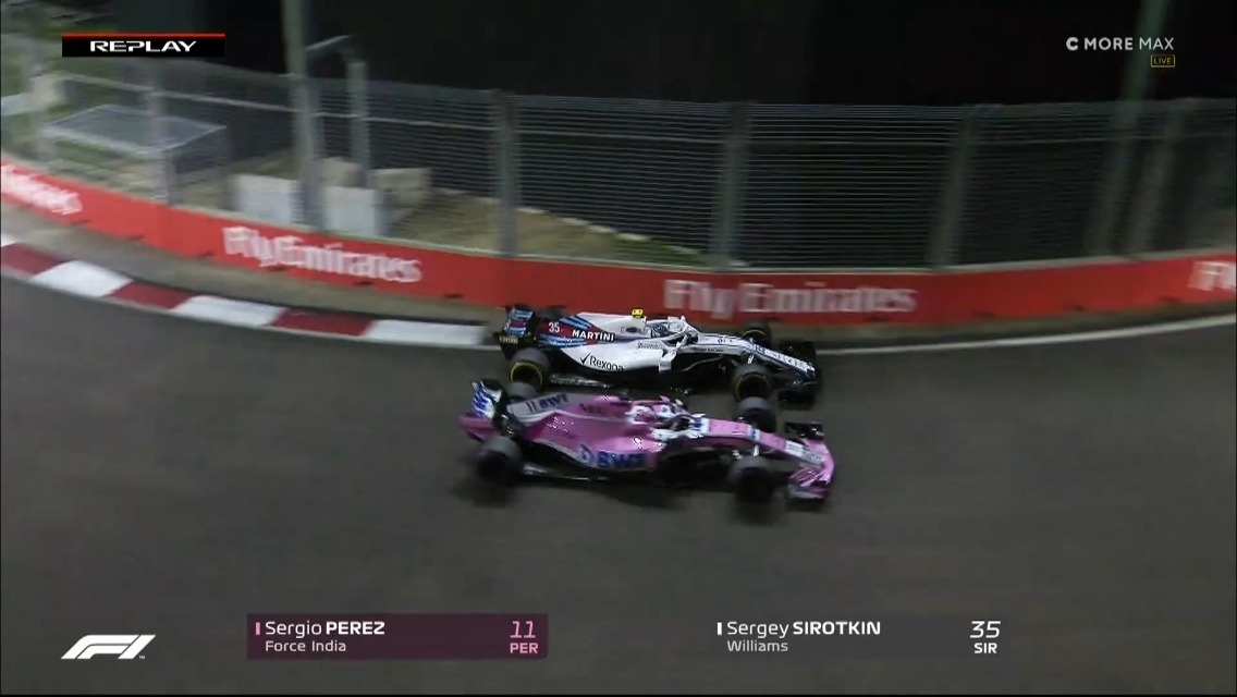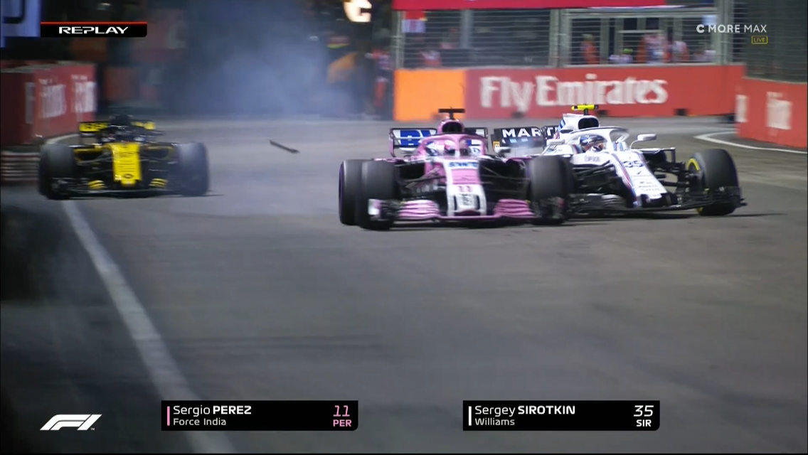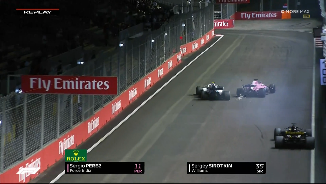 … Ja seuraavaksi Pérez kolaroi Sirotkinin kanssa kierroksella 34 yrittäessään päästä tämän ohi. Kumpikaan ei joudu keskeyttämään. Ajattelematonta riskinottoa ja toinen kolari Péreziltä tänään!