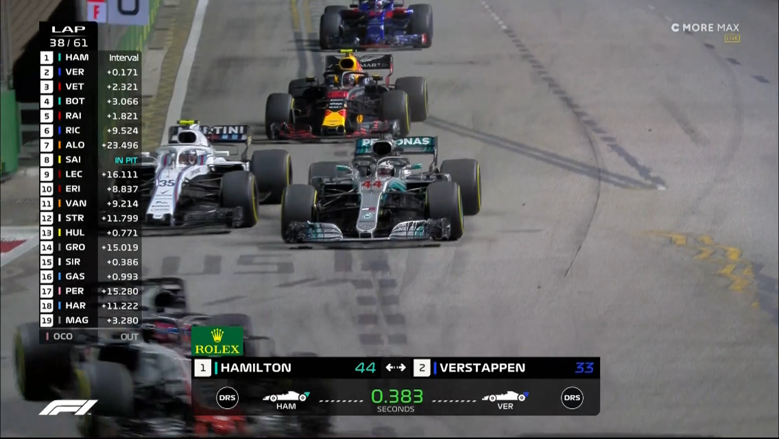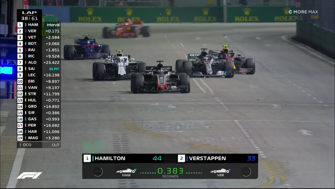 Kierroksia on jäljellä enää 10, ja kärjen kamppailun puute on virallisesti tylsää. On ollut mukavaa vaihtelua seurata sijojen 7-20 kilpa-ajoa, mutta mestaruus ratkaistaan kuitenkin siellä kärjessä, jossa tilanne on 1. HAM, 2. VER, 3. VET, 4. BOT, 5. RAI ja 6. RIC. Samassa järjestyksessä myös ajetaan maaliin, ja näin päättyy kärjen osalta pitkästyttävä ja muiden osalta mielenkiintoinen Singaporen GP. Sadetta ei sitten tullutkaan. Hamilton kasvattaa mestaruuspiste-eronsa Vetteliin jo 40 pisteeseen. Seuraava kilpailu ajetaan Venäjällä kuun lopussa.