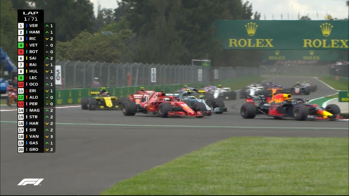 Startti yllättävän puhdas! Verstappen pitää ensimmäisen sijansa Hamiltonin kiitäessä toiseksi. Kukaan kärkikuljettajista ei ota riskejä, ja avauskierroksen jälkeen tilanne on 1. VER, 2. HAM, 3. RIC, 4. VET ja 5. BOT. Perässä tulevat Räikkönen ja Sainz, jotka kävivät myös kärkiviisikossa ensimmäisen kierroksen aikana.