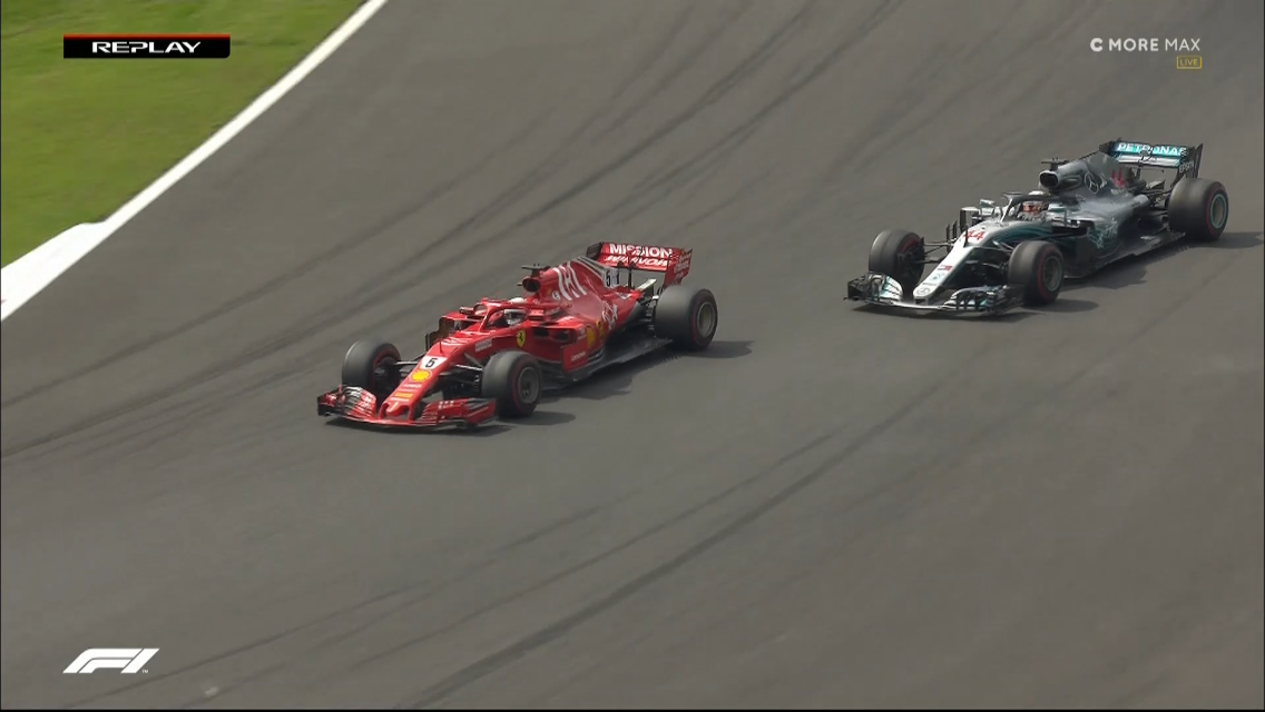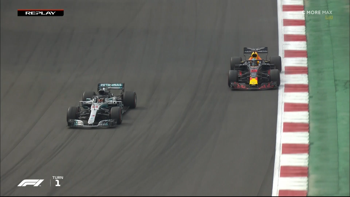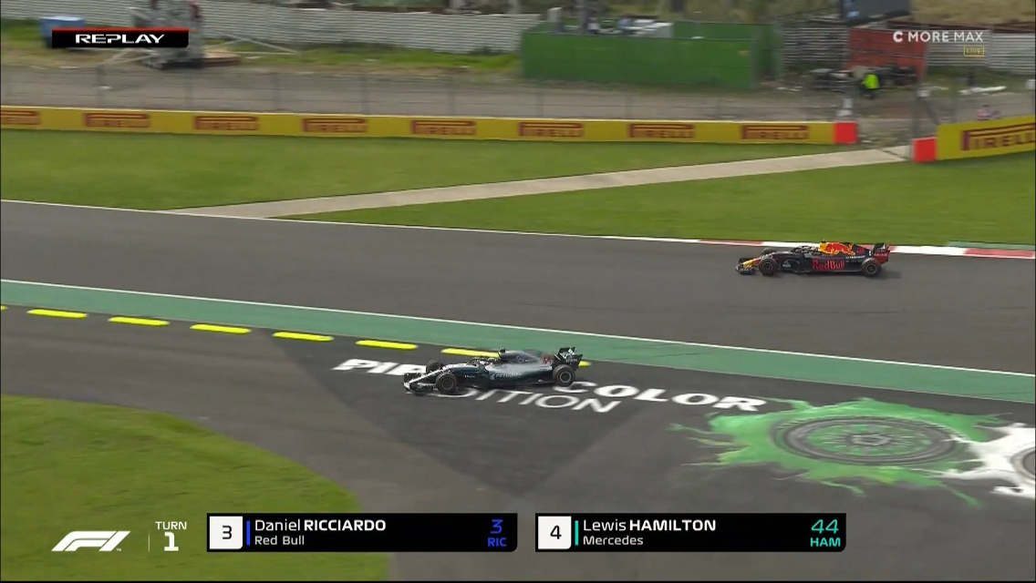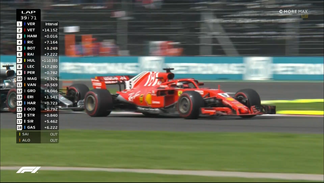 Ajamme kierrosta 47/71. Ricciardo kärkkyy Hamiltonin hännillä. Hamilton lukitsee renkaansa ja ajautuu ulos radalta, jolloin Ricciardo vetää kirkaasti ohi. Mercedes aikoo ottaa Hamiltonin sisään, jolloin Ferrari reagoi ja nappaa Vettelin varikolle ennen Hamiltonin saapumista. Varikolle saapuu Hamiltonin lisäksi myös Verstappen. Bottas tekee identtisen virheen Hamiltonin kanssa ja joutuu nurmikolle. Tilanne on 1. VER, 2. RIC, 3. VET, 4. RAI, 5. BOT ja 6. HAM. Bottas otetaan sisään, jolloin Mersut vaihtavat paikkaa.