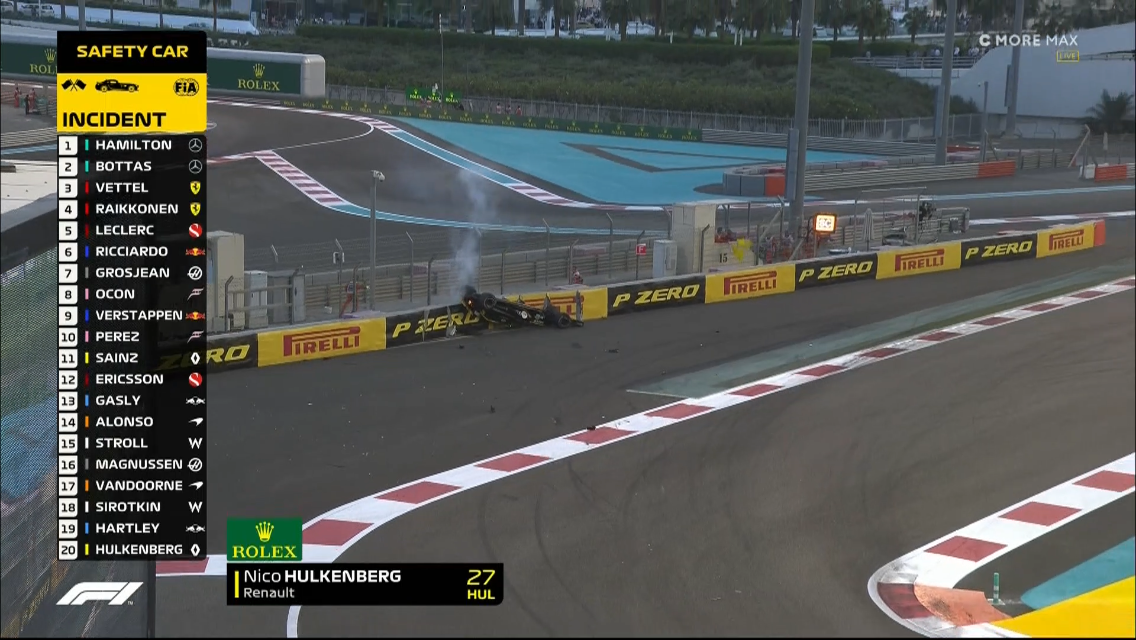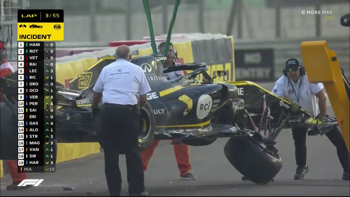 Startti on suhteellisen puhdas. Hülkenberg ajaa rajusti ulos ja hänen autonsa lentää seinään jääden ylösalaisin. Auto syttyy palamaan, ja kyseessä on kauden pahin ulosajo. Hülkenberg on jumissa autossaan, mutta puhuu. Turva-auto tulee radalle. Ensimmäisen kierroksen jälkeen tilanne on 1. HAM, 2. BOT, 3. VET, 4. RAI Ja 5. LEC.