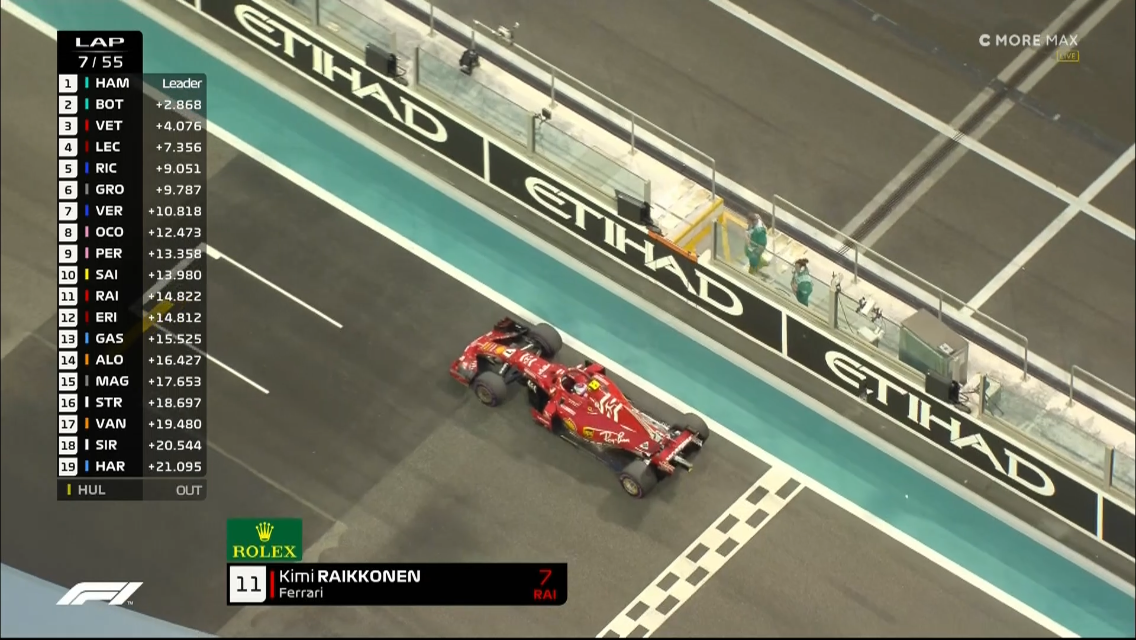 Verstappen ajaa tapansa mukaan aggressiivisesti ja hipoo muita autoja. Kierroksella 7 Räikkönen keskeyttää yllättäen lähtösuoralle, syynä tehojen loppuminen autosta. Onpa ikävä viimeinen kilpailu Räikköselle Ferrarin punaisissa! Räikkösen keskeyttämisen jälkeen kärjen järjestys on 1. BOT, 2. VET, 3. RIC, 4. HAM ja 5. VER. Redbullien vauhti ei ole kovinkaan vahvaa, ja vaikka Verstappen ohittaa Hamiltonin tämän varikkopysähdyksen jälkeen, ottaa Hamilton paikkansa samantien takaisin. Hamilton raportoi muutaman kierroksen jälkeen, että vasta alle laiteut renkaat ovat huonot. Kierroksella 16 Vettel tulee varikolle, ja heti perään sisään otetaan Bottas.
