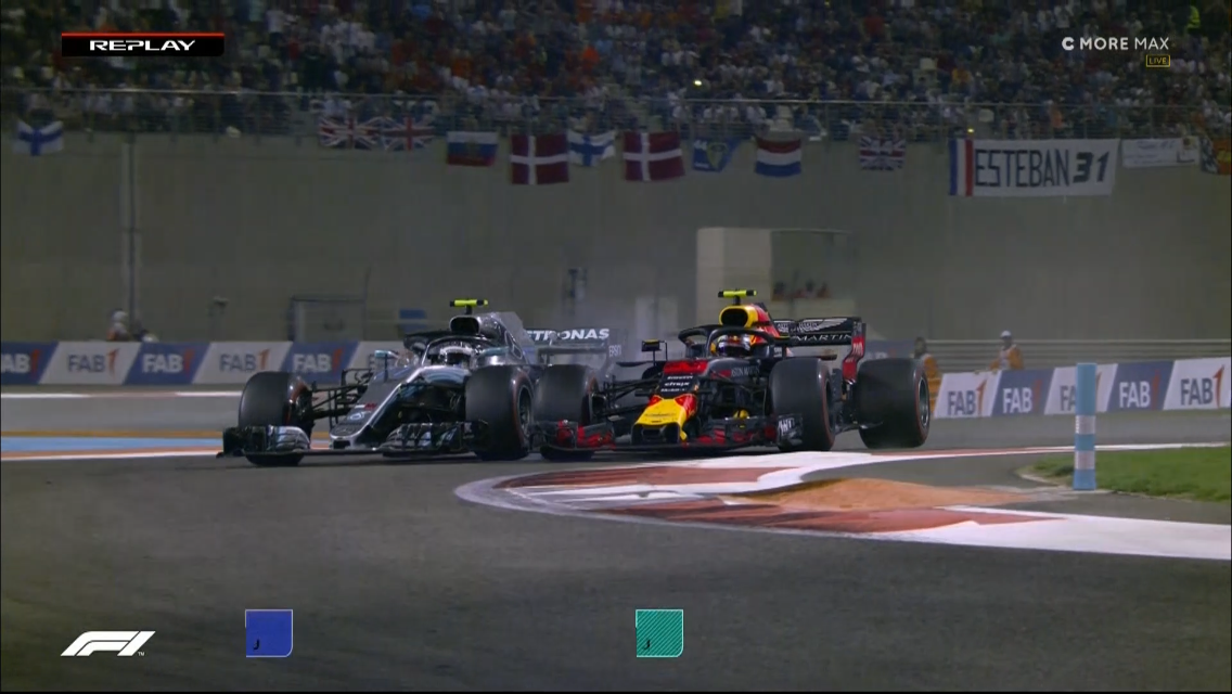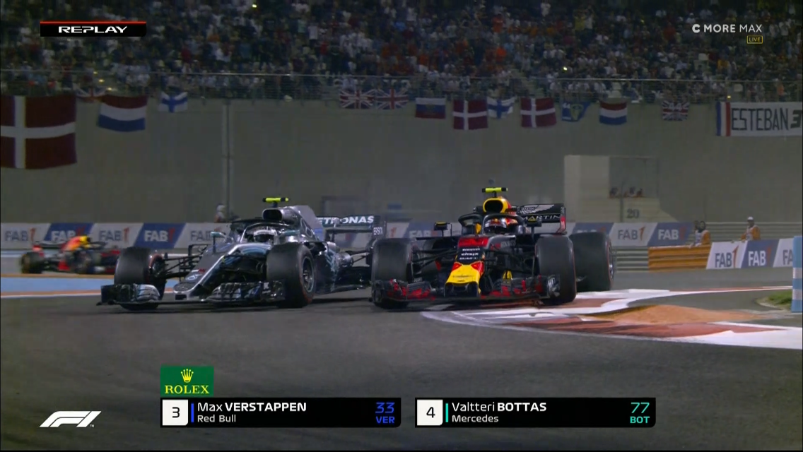 Kierroksella 34/55 reaalitilanne on 1. HAM, 2. BOT, 3. VET, 4. VER ja 5. RIC. Kaikki ovat tehneet yhden varikkopysähdyksen. Kahden kierroksen kuluttua Vettel ohittaa Bottaksen jälkimmäisen ajovirheen vuoksi. Tuomaristo tutkii jälleen mutkien suoraksi vetämistä, kun Bottas mittelee Verstappenin kanssa. Kaksikko ottaa uudelleen yhteen kierroksella 38, jolloin Verstappen osuu Bottaksen autoon. Ei käy kuinkaan. Tilanne on 1. HAM, 2. VET, 3. VER, 4. BOT ja 5. RIC.