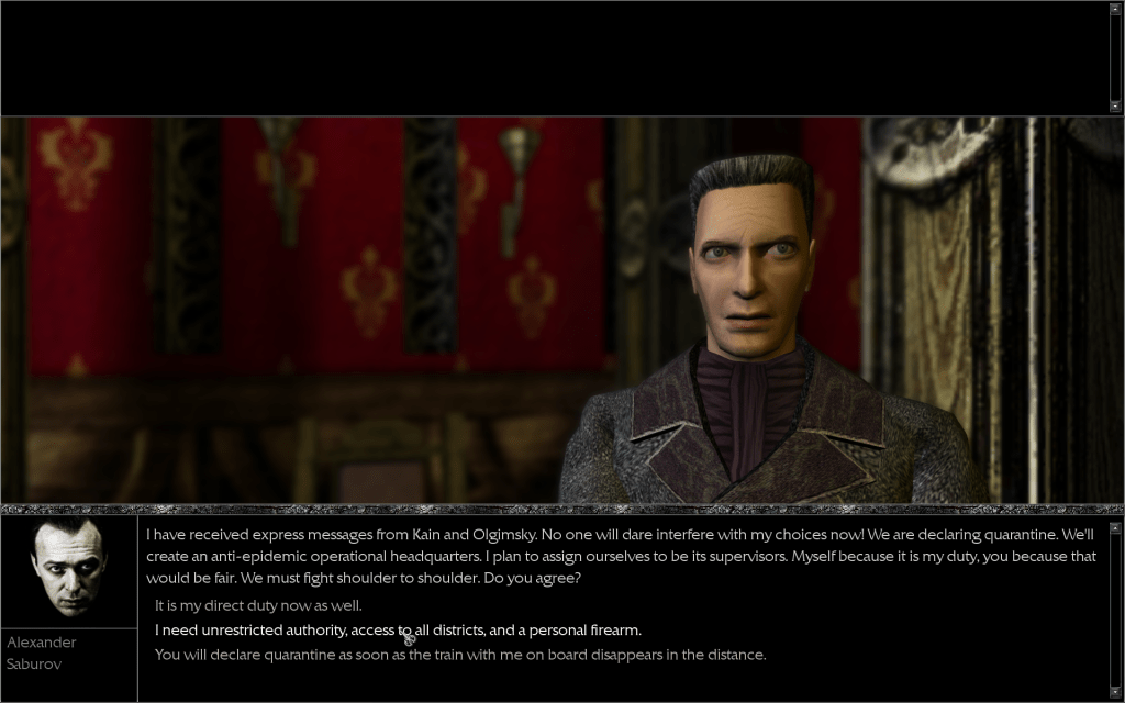 Alexander on kanssani samaa mieltä: kaupunkiin pitää julistaa hätätila epidemian leviämisen pysäyttämiseksi. Hän kuitenkin tarvitsee hätätilan julistamiseen luvan muilta kaupungin päämiehiltä, joten suuntani vie Georgiy Kainin ja Vlad Olgimsky Seniorin luokse. Pyydän heiltä lupaa hätätilan julistamiseen, ja molemmat myöntävät Alexanderille ylimääräistä valtaa epidemian pysäyttämiseksi. Palaan Alexanderin luokse ja hän antaa minulle aseen kiitoksena. Ensimmäisen päivän uudelleenpeluussa löysin yhden aseen, joten nyt minulla on kaksi revolveria! Näin on hyvä! Hätätila julistetaan, ja työ epidemian pysäyttämiseksi jatkuu.