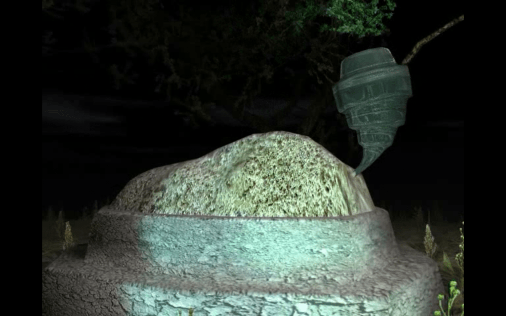 Polyhedron nousee kuumottavana kaupungin laidalla painovoimaa uhaten. Kuva sisältä on päivältä 12 eli viimeiseltä päivältä.