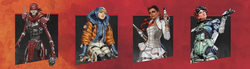 Horizon on Apexin liikkuvimpia hahmoja: hänen kykyjään ovat painovoimahissi, jolla hän pääsee nousemaan muita pelaajia korkeammalle. Hän pystyy myös luomaan mustan aukon, joka vetää vihollisia puoleensa. Loba on varas, joka pystyy tekemään mustan marketin, jonka kautta hän voi varastaa lootia ympäristöstään. Loballa pääsee myös liikkumaan pitkiä etäisyyksiä hänen teleporttirannekorunsa avulla. Apex Legendsin mielenkiintoisimpia hahmojen välisiä taustatarinoita on Loballa ja Revenantilla: kun Loba oli pieni, Revenant tappoi verisesti hänen vanhempansa. Nyt Loba on palannut kostamaan. Revenant on kyborgiin ladattu ihmismieli, joka nauttii tappamisesta. Revenantilla on matala ja särmikäs ääni, ja hänen puhettaan jää kuuntelemaan pelokkaan innoissaan. Revenant pystyy estämään muita legendoja käyttämästä kykyjään ja luomaan kuolintoteemin, johon hän palaa ensimmäisen kerran kuollessaan. Wattson puolestaan on sähköinsinööri, joka on ollut luomassa yhtä peliareenaa isänsä kanssa. Hän pystyy luomaan sähköaitoja ansoiksi vihollisille sekä luomaan sähköpylonin, joka lataa hänen ja tiimikaveriensa suojia. Eri hahmoilla pelataan eri strategioilla: Loballa ja Wattsonilla pelatessani pelaan ns. long gamea eli laskeudun hiljaiseen paikkaan ja piilottelen vihollisilta mahdollisimman pitkään, kun taas Horizonilla ja Revenantilla voi pelata aggressiivisemmin ja kohdata vihollisia rohkeammin.