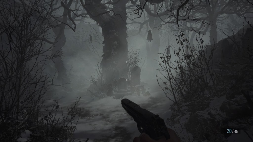 Virhe. Virhe. Virhe. Ethan poistuu Duken luota alttarilta avaamastaan portista ja kohtaa metsässä käveltyään hautoja, joiden ympärille on ripoteltu nukkeja. Ympäröiviin puihin on myös hirtetty nukkeja. Tässä kohtaa on varmaan hyvä kertoa, että pelkään nukkeja (kiitos lapsuudentrauma Chucky)? Matkan on kuitenkin jatkuttava, joten suuntaan nukkejen ohi sumuisessa metsässä. Edessä on riippusilta, ja hämmennyksekseni silta ei edes uhkaa sortua altani kertaakaan siitä kulkiessani. Hienoa pelolla leikittelyä!