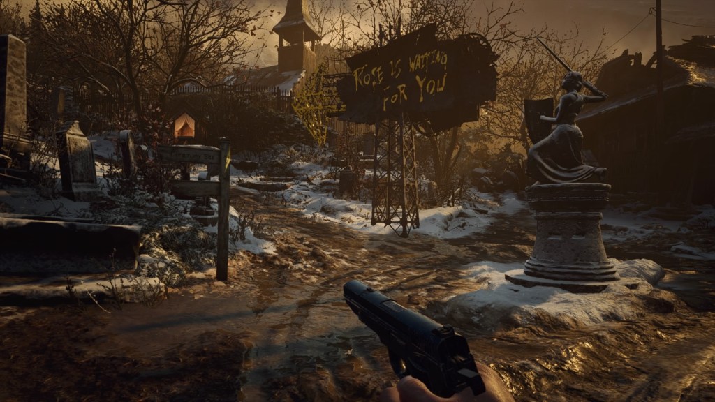 Seuraavaksi Ethan löytää seremoniapaikan ja alttarin, jotka ovat mitä ilmeisimmin rituaalin näyttämö myöhemmin pelissä. Ethan kohtaa uudelleen kauppias-Duken ja näyttää hänelle löytämäänsä oranssia lasipurkkia. Duken paljastus saa sekä Ethanin että pelaajan voimaan pahoin: purkissa on Ethanin tyttären Rosen pää. Kristallisoitunut, mutta pää kuitenkin. Duke kertoo, että krisallisoitu Rose on jaettu neljään purkkiin, mutta hänen olemuksensa on edelleen koskematon, ja tytär voitaisiin palauttaa kokonaiseksi tuomalla kaikki purkit yhteen. Pään sisältämä purkki oli Dimitrescun linnassa, joten lienee helppoa päätellä, keillä on loput Ethanin tyttären palasista: Benevientolla, Moreaulla ja Heisenbergilla. Duke näyttää tien kylässä sijaitsevaan taloon, jossa on punainen savupiippu: sieltä Ethan löytäisi avaimen, jolla hän pääsisi Benevienton luo ja siitä eteenpäin. Palaan tutkimaan kylää ja uusia rakennuksia. Löydän yhdestä talosta vihjeen, jossa on yksi kuumottavimmista viesteistä, joita autiosta kylästä voi löytää: ”Look out the window”. Kyllä kokematonkin kauhupelaaja tietää, että edessä on jumpscare, mutta kyllä se silti säikäyttää, kun katsoo ulos ikkunasta ja kimppuun hyökkää hirviö. *surprised Pikachu*. Kun hirviö on hoideltu, voin hoitaa pulmapelin loppuun ja jatkaa matkaani. Löydän talon, jossa on punainen savupiippu, ja suuntaan sisälle. Avaimen lisäksi sisältä löytyy lappu, joka antaa Ethanille lisää vihjeitä: ”[Rose] is the chosen child. She will return to her original form no matter what befalls her.”. Matkalla punaisen savupiipun taloon Ethan on onnistunut löytämään työkalun, jolla kylään ripotelluista kaivoista voisi nostaa esineitä, joten kierrän kylän vielä kerran lootin perässä ennen etenemistä.