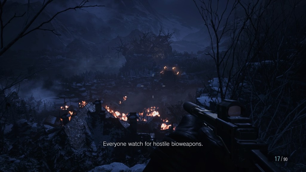 Chris Redfield tupakoi autossaan ja kertaa pelin tapahtumat. Chris nousee autosta ja alkaa käydä selväksi, että nyt otetaan ohjat hänestä. Ensimmäisenä avaan inventaarion ja henkäisen: sarjatuliaseita ja niihin määrissä panoksia! Huomattavasti parempi tilanne kuin Ethanilla vielä hetki sitten. Chris suuntaa öiseen tulessa olevaan kylään, joka on vähintään yhtä henkeäsalpaava näky kuin Ethanin ensi kertaa saapuessa kylään. Ethan ja kumppanit huomaavat, että heidän entinen työnantajansa BSAA (eli Bioterrorism Security Assessment Alliance) on myös saapunut paikalle.