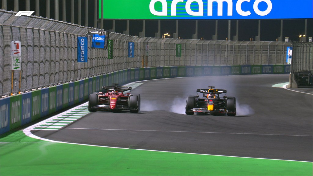 Turva-auto poistuu radalta kierroksen 20/50 päätteeksi. Leclerc peittää hienosti Verstappenia, joka kärkkyy kärkisijaa aivan liian lähellä. Sainz ohittaa Pérezin – tai sitten Pérez päästää Sainzin ohi välttyäkseen mahdolliselta rangaistukselta. Hamilton kamppailee Magnussenin kanssa sijasta 6.