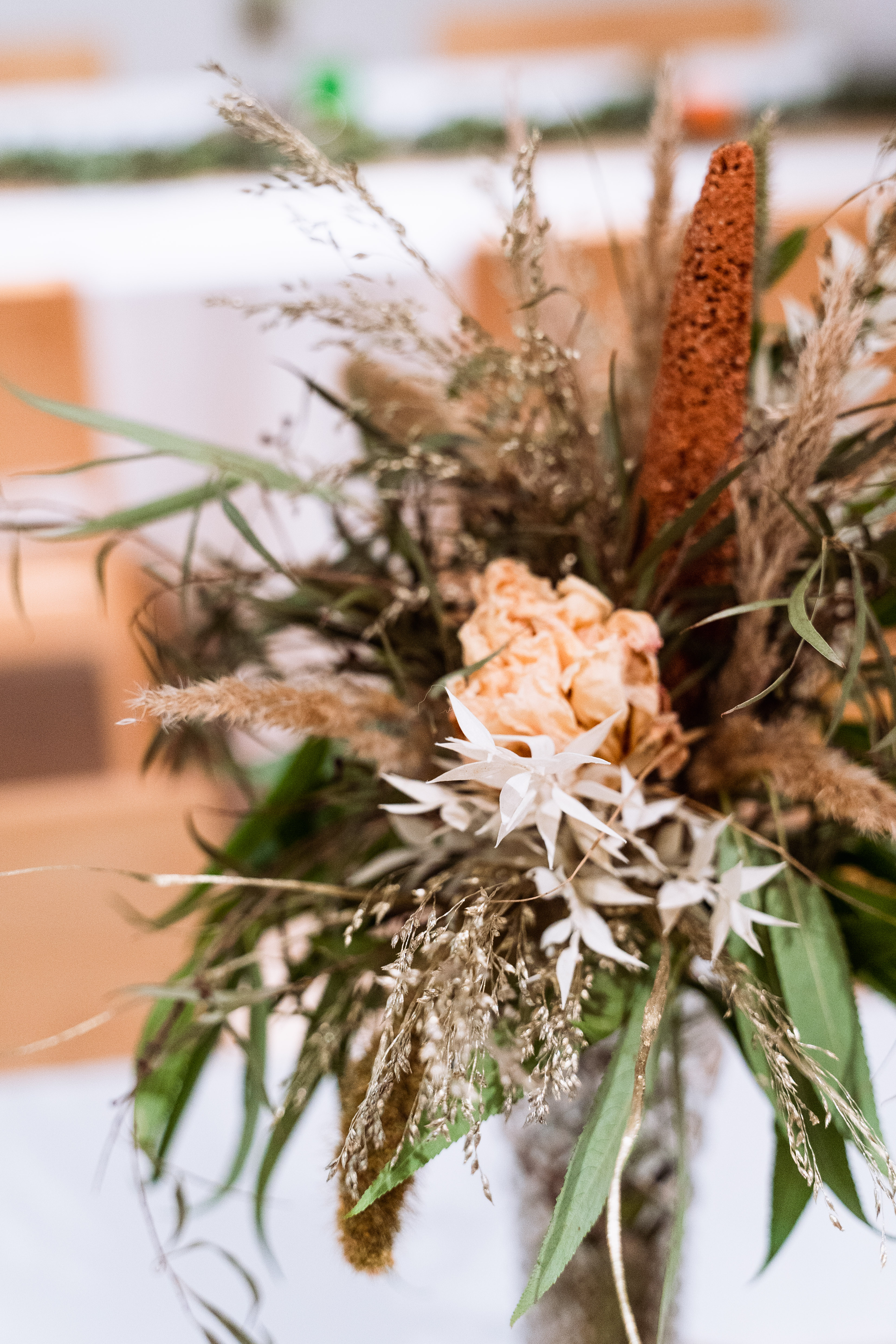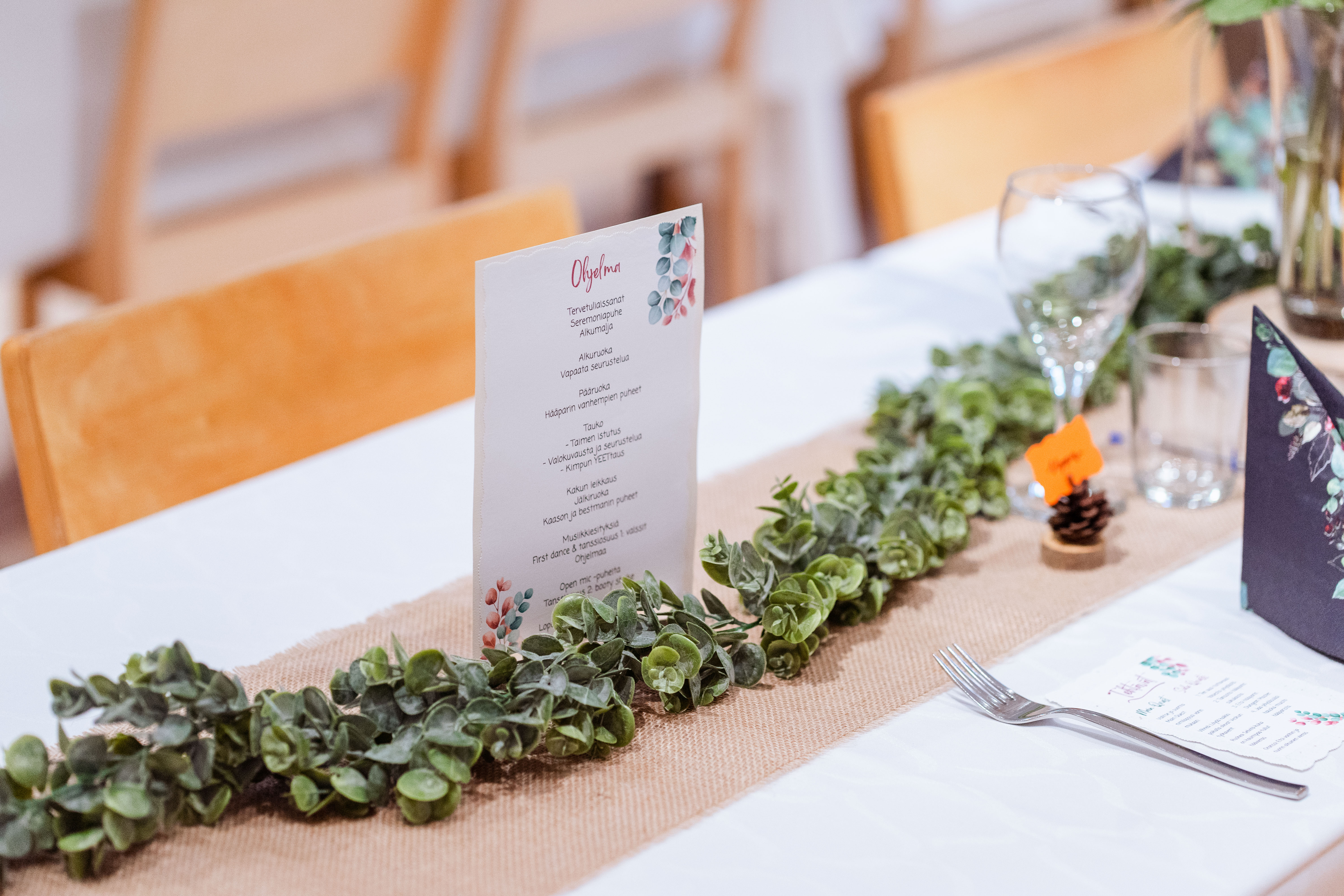 Olen ihan uskomattoman tyytyväinen meidän häiden koristeluihin! Paras kehu, mitä häistä saimme, oli se, että häät olivat meidän näköisemme – ja näin todellakin oli! Hankimme paljon koristeista käytettynä jo naimisiin menneiden ystävien häistä tai hääkirppareilta. Eukalyptus-köynnökset vuokrasimme Hurmaavasta Hattarasta, ja omaksi ostamamme koristeet kuten juuttikaitaliinat, vieraskirjan ja ohjelmapaperien puupidikkeet hankimme My Dream Day’sta. Pöytänumerot lainasin töistä, ja keskikoriste-puukiekot olivat isin käsialaa. Maljakoissa ja kynttiläkipoissa teema oli mix and match, eli keräsin omat, äidin, siskon ja mummojen maljakot ja kynttiläkipot yhteen ja katsoin syksyiseen väripalettiin sopivat. Hankin Suomalaisesta kirjakaupasta kivan värisiä kartonkeja ja taitoin niihin ohjelmaa, bingoa, menua sun muuta printtituotetta! Koristeluihin meillä meni yhteensä 465 €.