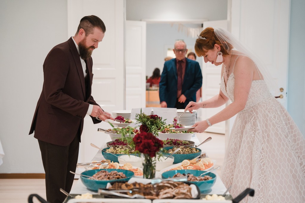 Yksi suuri pohdinnan aihe oli myös catering. Mietimme muutamaa vaihtoehtoa, mutta meille oli aika selvää alusta asti, että valitsisimme 4cateringin. Ja onneksi teimme niin, sillä palvelu oli ensiluokkaista ja ruoka niin hyvää, että haaveilen siitä edelleen! Meillä oli periaatteena, että menuvaihtoehtoina olisivat kala- ja kasvisruoat, ja olimme todella tyytyväisiä valintoihin! Pääruokavaihtoehdot olivat voissa haudutettua kuhaa tai nokkosella höystettyjä kasvis-linssipihvejä sekä savupaprika-tomaattikastiketta, ja näiden kaverina oli juures-perunapyrettä. Alkuruoakana oli useita maistuvia salaatteja, ja jälkiruoaksi suklaamoussekakkua ja metsämarjakakkua. Nam! Catering tuli kaiken kaikkiaan maksamaan 3600 €, ja se oli jokaisen euron arvoinen.