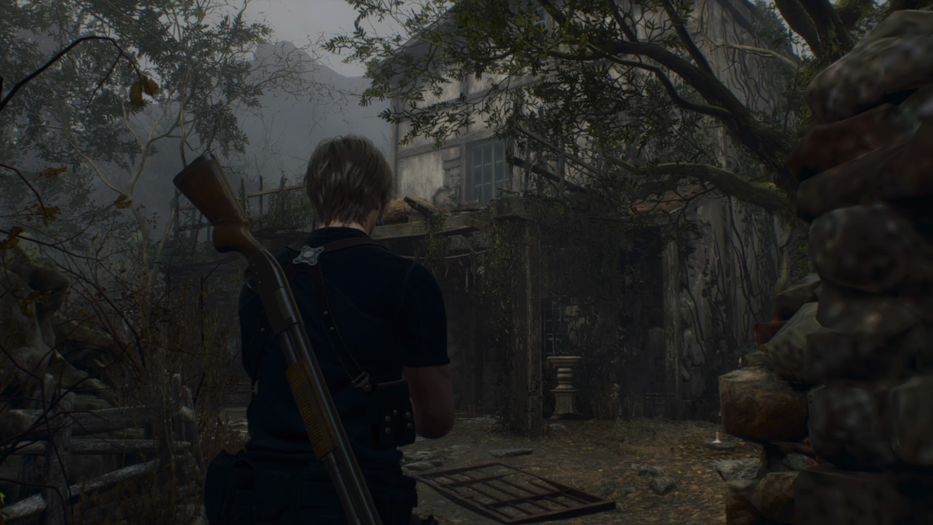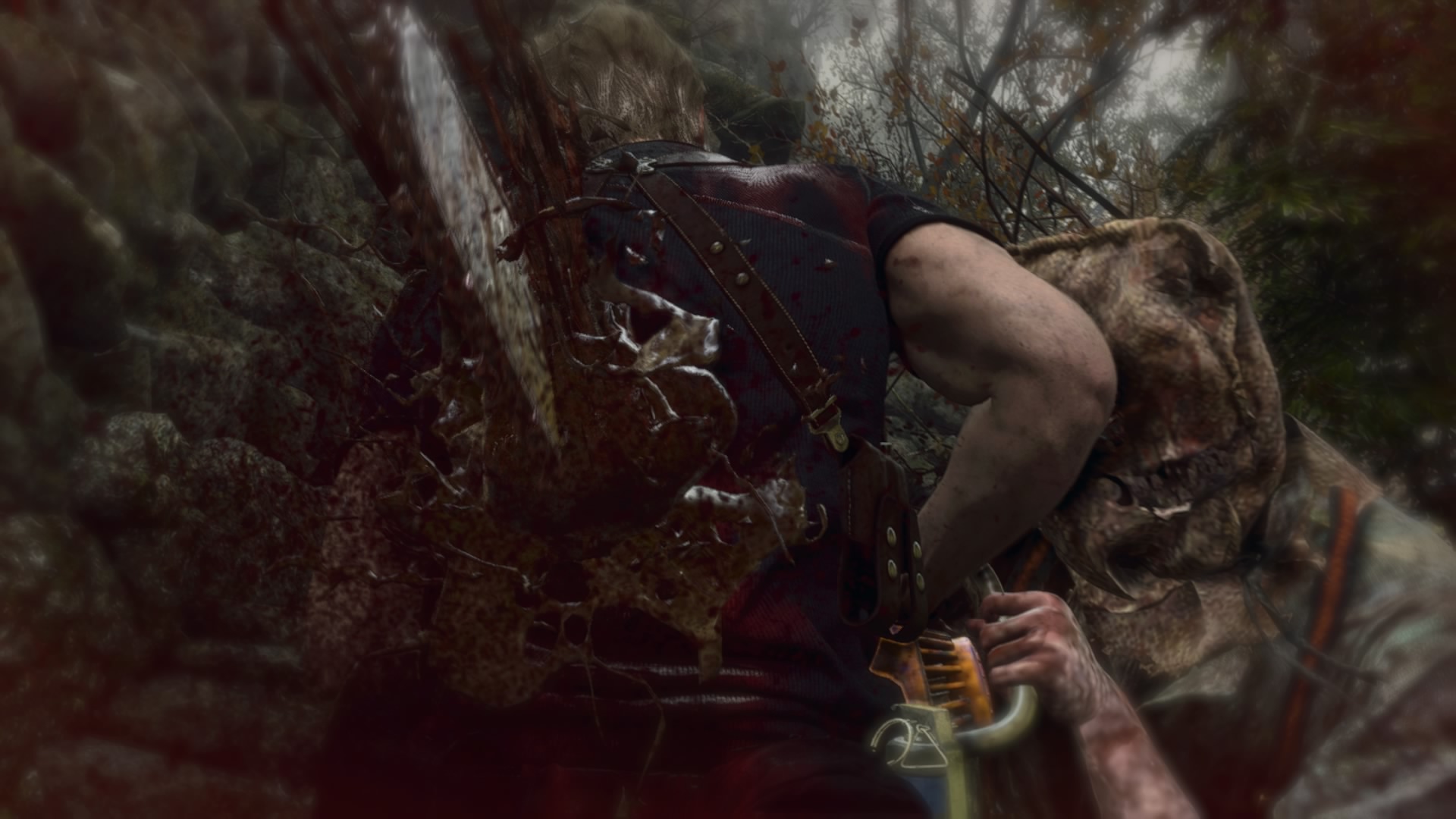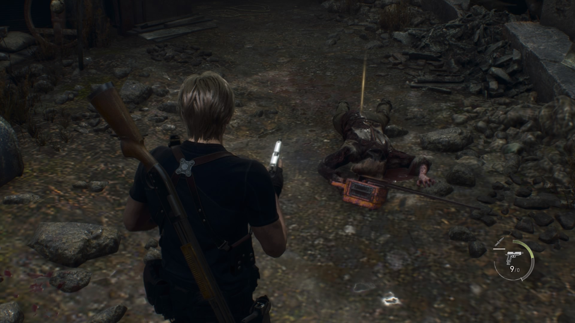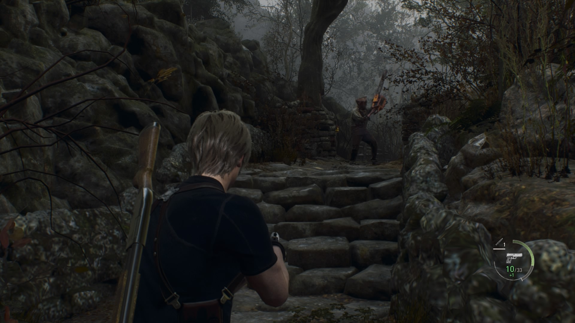 Kun paikka on tyhjennetty, palaan shoppailemaan merchantin luo ja sitten siirryn seuraavalle alueelle. Aluetta tutkiessani mietin, että moottorisahakaveria ei ole näkynyt hetkeen. Käännyn kulman taakse, ja siellähän on moottorisahakaveri – kuin tilauksesta! Leon estää moottorisahaa pureutumasta häneen veitsellään, mikä on varmaankin pelin coolein liike. Moottorisahakaveri tekee silti Leonista muussia neljä kertaa, mutta kohtaaminen ei tunnu vaikealta – tämä nyt vain on oneshot vihollinen, jonka kanssa pitää oppia taistelemaan tietyllä tavalla. Lopulta harhautan moottorisahakaverin seuraamaan minua takaisinpäin lähes merchantille asti, missä saan pistettyä hänet viimein matalaksi.