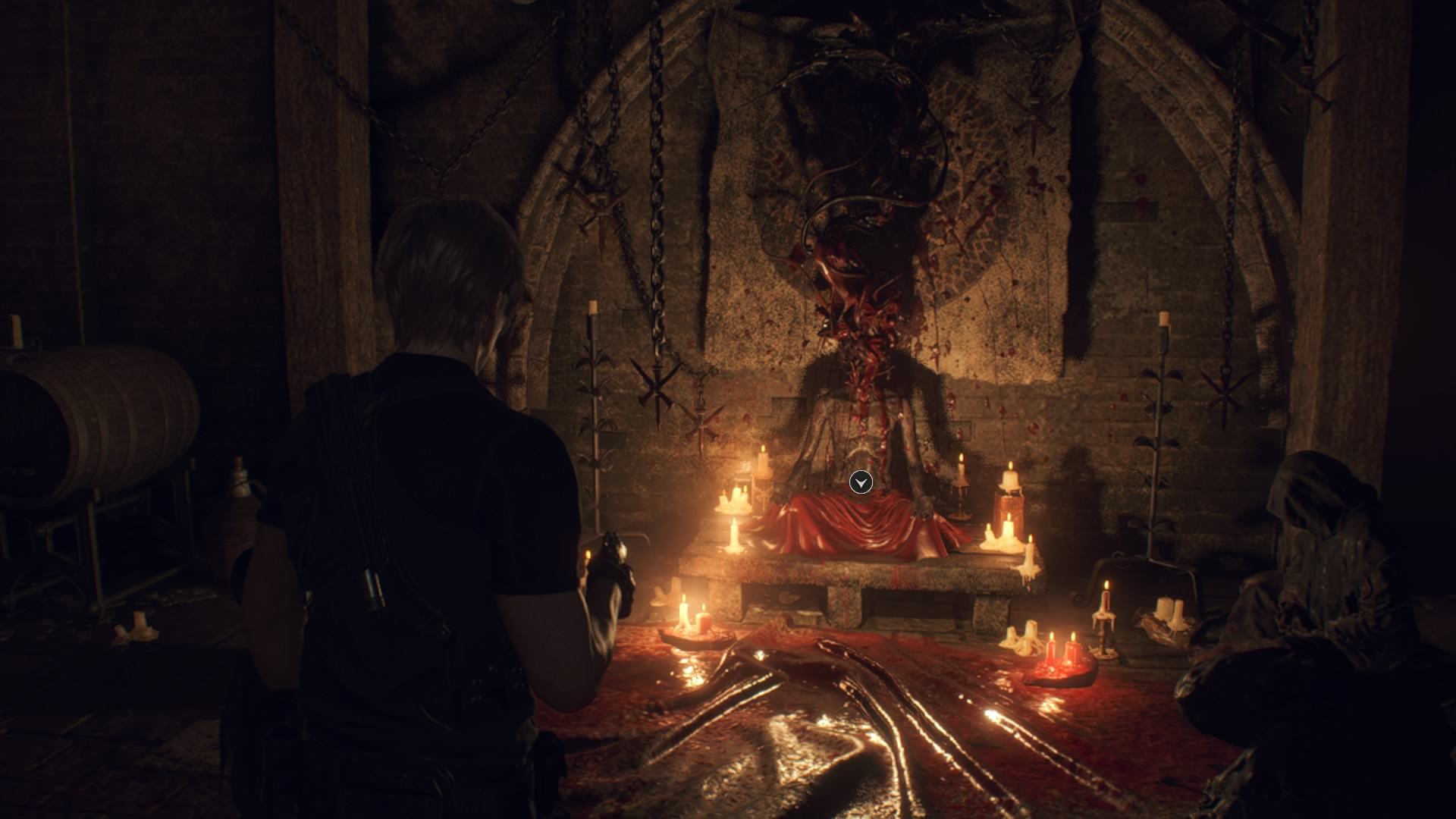 Leon on nyt yksin, ja on aika jatkaa linnan tutkimista! Ensimmäisenä tie vie hämäriin käytäviin, ja olen iloinen siitä, kuinka onnistuneesti kauhutunnelma ja aito kuumottavuus on tuotu tähän osuuteen. Tässähän alkaa ihan pelottaa! Saavun alttarille, jossa kyyryyn kuolleet ruumiit palvovat veristä hahmoa, jonka päästä työntyy vieläkin verisempi mutaatio. Taustalla kuuluu äänien kuoro ”gloria a las plagas, gloria a las plagas.”.