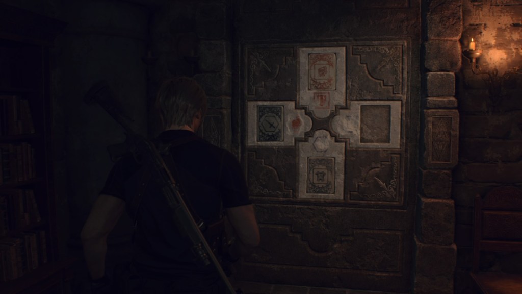 Adan poistuttua on aika tutkia huonetta tarkemmin. Oudon kotoisassa huoneessa on yksi tekijä, joka saa niskavillat nousemaan pystyyn: haarniskat, jotka koristavat huoneen nurkkia. Kannattaa käydä lukaisemassa alkuperäisen Resident Evil 4 -blogikirjoituksen linnaosuudessa oleva taustoitus siitä, miksi haarniskat ovat minulle tämän pelin pelottavin asia. Huoneessa on kivilaattapulmapeli, jota ratkaistessa pelkään koko ajan, että haarniskat heräävät eloon. Eivät ne herää – vielä.