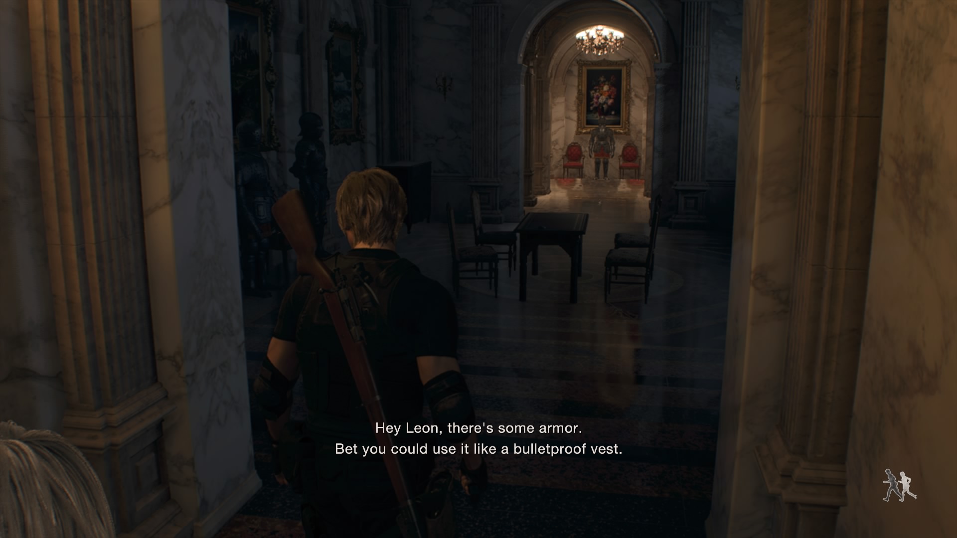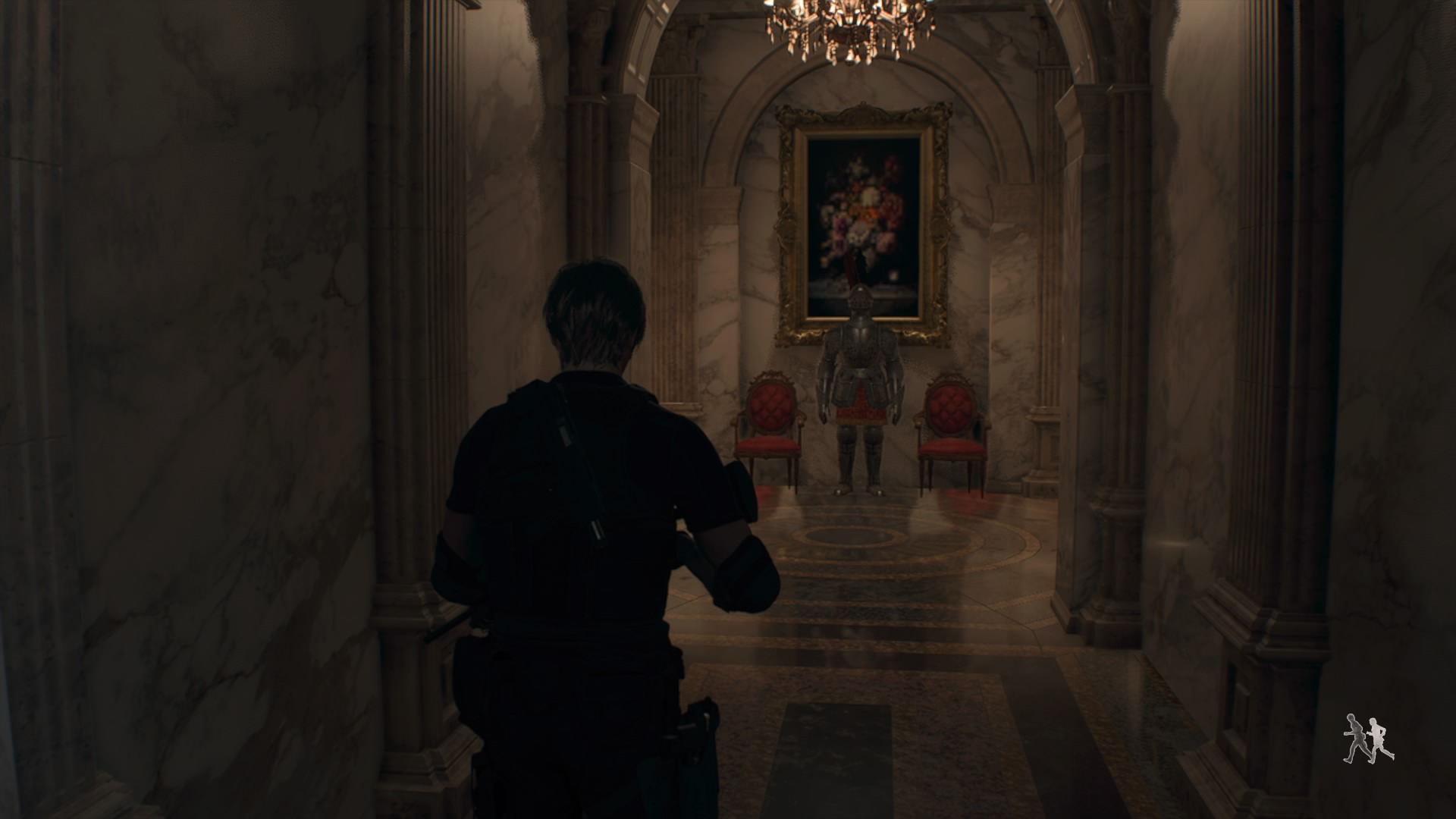Koska kellaria kohti meneminen ei houkuta, menen seuraavaksi tutkimaan käytävää, jonka päämäärä ei ole selvä. Nope. Pelkään aidosti vain yhtä osiota tässä pelissä, ja Ashleyn sanoessa: ”Hey Leon, there’s some armor”, tiedän sen olevan edessä. Haarniskapelkoinen ei nimittäin varsinaisesti nauti siitä, kun haarniskat heräävät eloon ja hyökkäävät porukalla päälle suljetussa tilassa. (Haarniskapelon taustat tässä blogitekstissä)