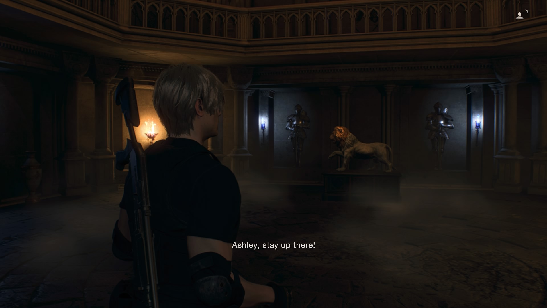 Kun laitan puuttuvat eläinten päät paikoilleen patsaaseen, alkaa cutscene. Leon jää kalterien taakse jumiin, ja Ashley joutuu erilleen Leonista. Nyt on aika pelata Ashleylla, ja hänen pitää löytää keino vapauttaa Leon. Ashleylla ei luonnollisesti ole aseita, joten hänen kanssaan täytyy hiippailla ja varoa vihollisia – jotka tietenkin ovat haarniskoja! Ensimmäisenä Ashleyn tie vie sokkeloiseen kirjastoon, jota Ashley tutkii sinistä valoa hohtavan lyhdyn valossa. Arastan jokaista matkalla vastaan tulevaa haarniskaa, mutta ne eivät liiku – vielä.