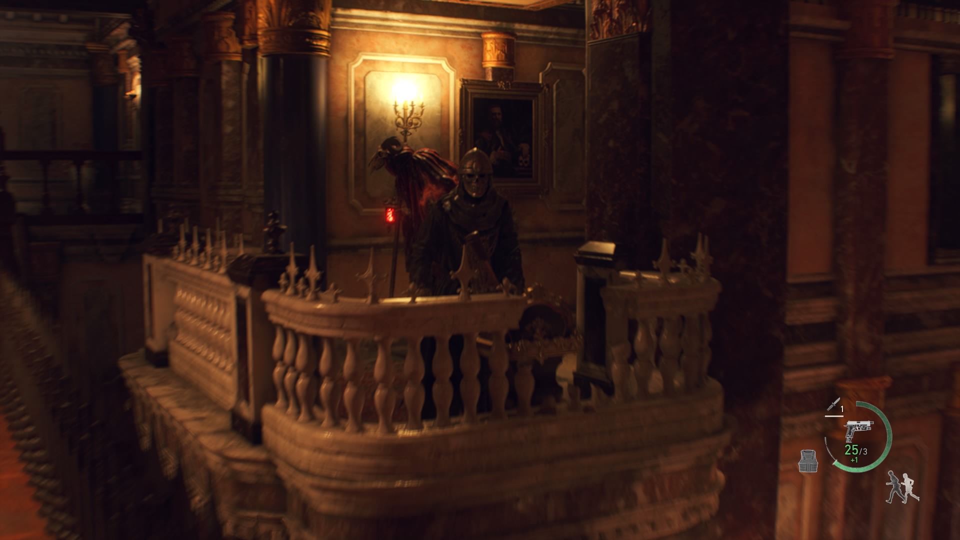 Resident Evil 4 remake on haarniskahuoneessa alkuperäistä armollisempi, sillä haarniskat hyökkäävät kimppuun muutamien vihollisten aalloissa. Ashley nakkaa ylhäältä sinistä tulta haarniskojen kimppuun, ja minä yritän tärisevin käsin tähdätä niiden kaulassa oleviin mutaatioihin. Luoteja kimpoilee haarniskoissa – yritäpä itse pysyä rauhallisena näin peloissaan. Selviän kuin selviänkin haarniskahuoneesta, mutten vielä kaikista pelin elävistä haarniskoista.