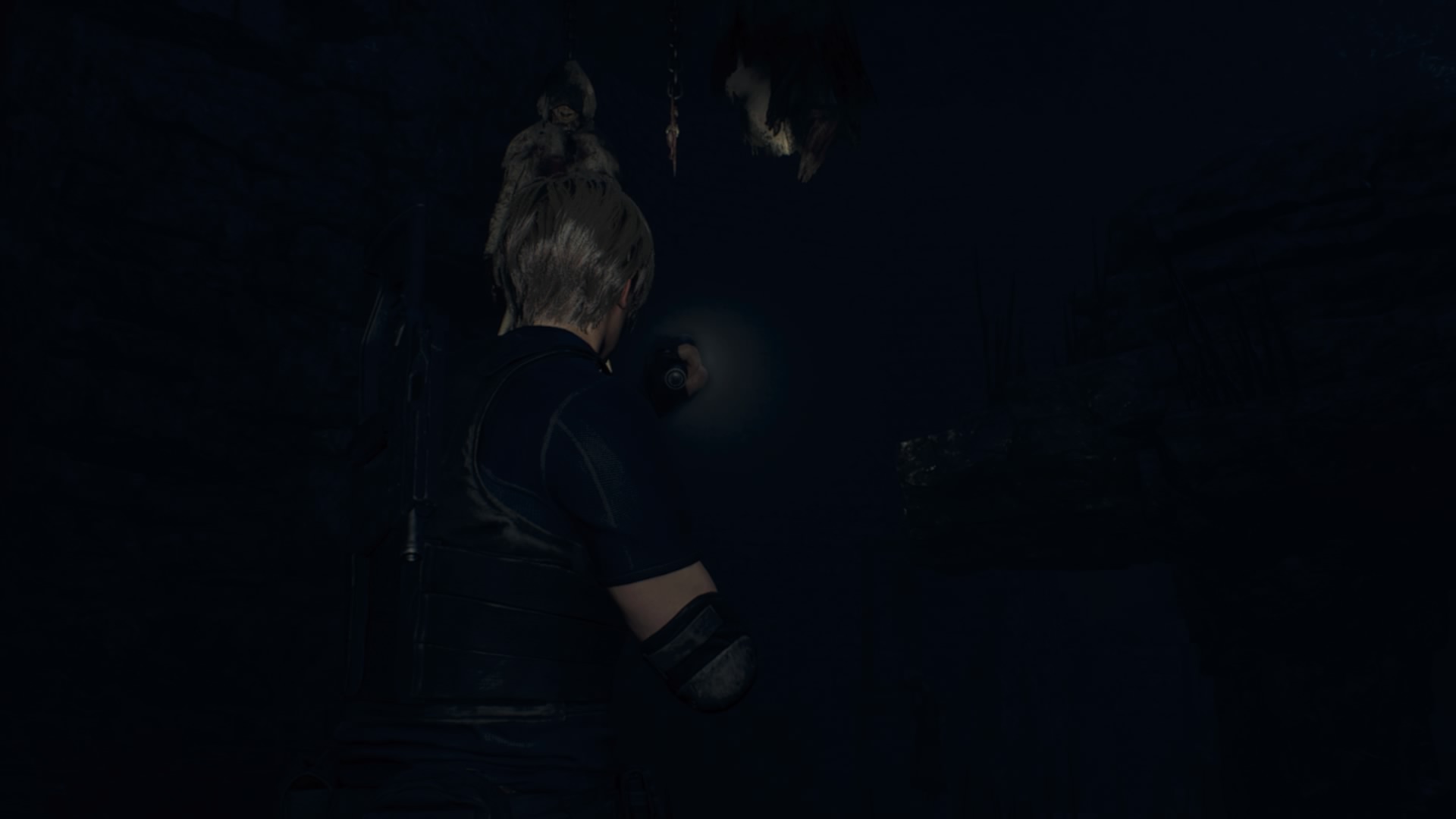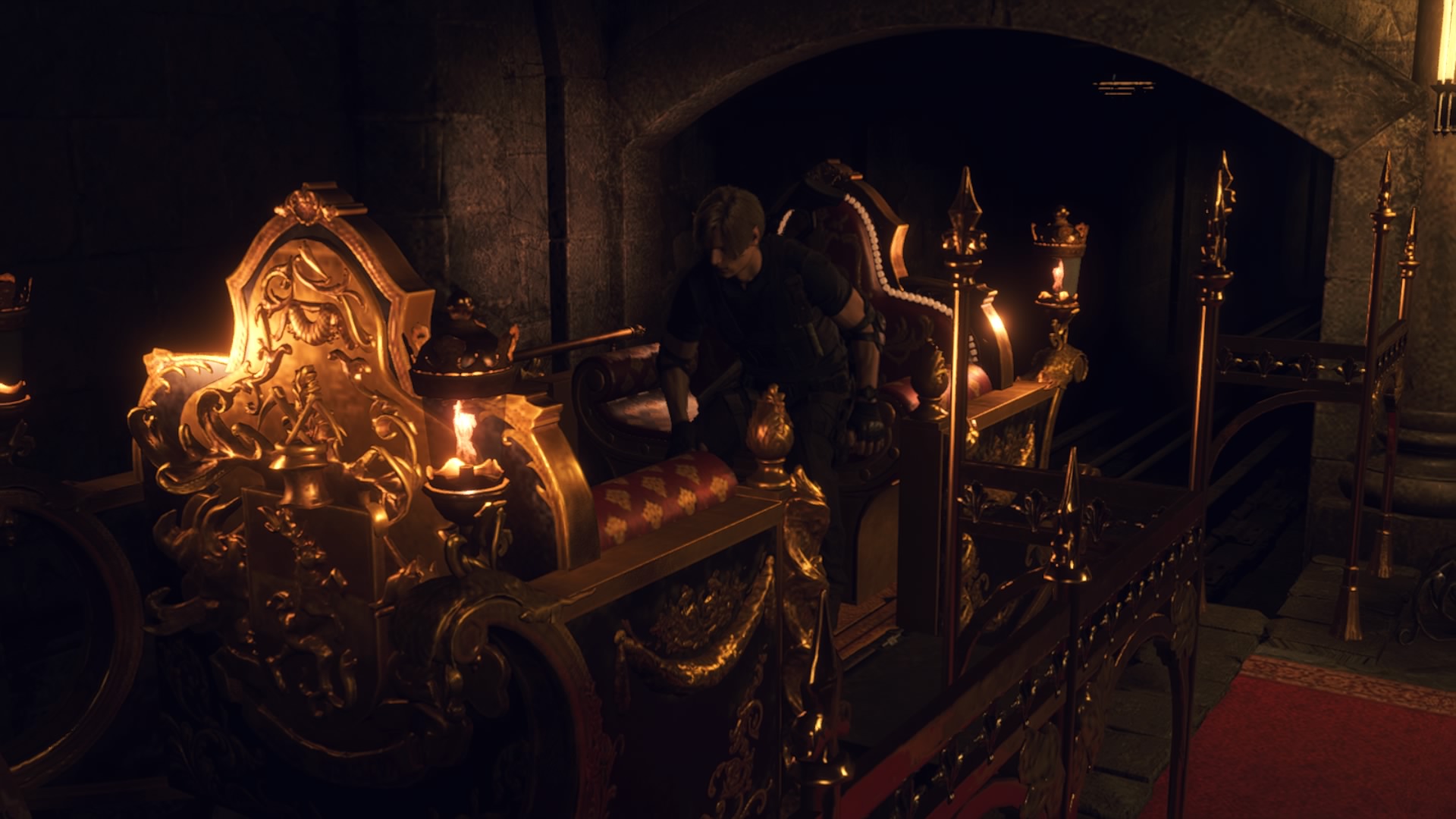 Portti aukeaa, ja Leon kuulee Ashleyn huutavan. Valtaistuinsalissa tehdään rituaalia, jossa Ashleylle juotetaan tummaa nestettä, ja hänen kasvoilleen on piirretty verellä kultistien symboli. Vihollinen tarttuu Leoniin kiinni ja pakottaa tämän katsomaan rituaalia. Ramón ilkkuu valtaistuimella ja hyvästelee Leonin, minkä jälkeen Leon yeetataan salin keskellä olevasta kuilusta alas. Leon putoaa pimeyteen ja tarttuu pudotessaan ketjuun, joka pelastaa hänen henkensä. Leon laskeutuu linnan alla olevaan luolaan, joka on märkä ja pimeä.