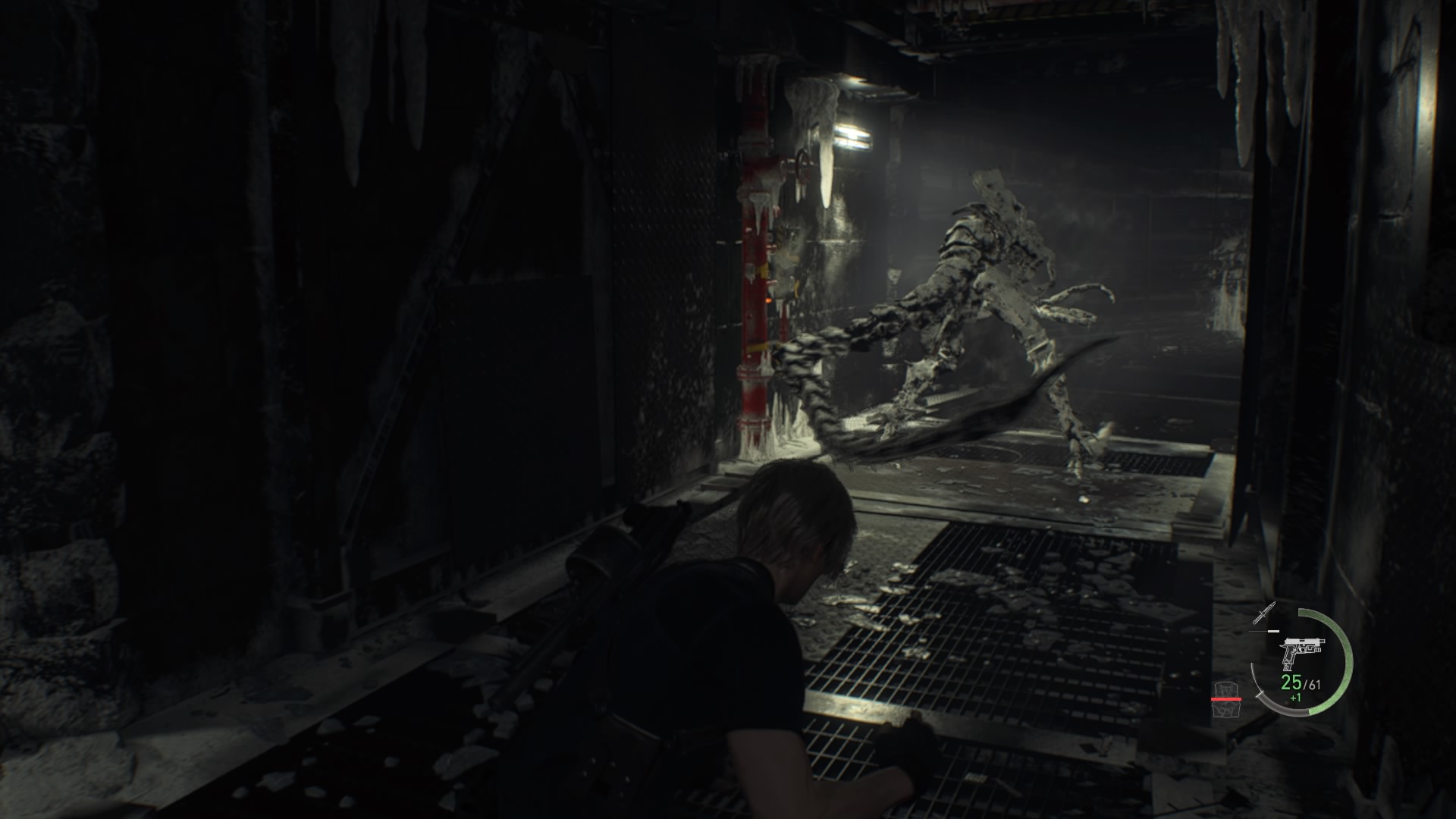 Yritän ensimmäisellä yritykselläni vain rynniä alueen läpi ja esittää, että koko verdugoa ei edes ole paikalla. Noh, huonostihan siinä käy. Toisella yrityksellä päätän mennä alueen niin kuin se on suunniteltu mentäväksi, ja tutkin sen perinpohjaisesti aktivoiden matkalla ansoja ja antaen verdugolle pataan. Tai no, totuushan on se, että oikeasti verdugo antaa Leonille pataan, ja kun Leon pääsee hissiin terveys punaisella huutaen, olen yllättynyt siitä, että selvisin paikasta toisella yrityksellä.