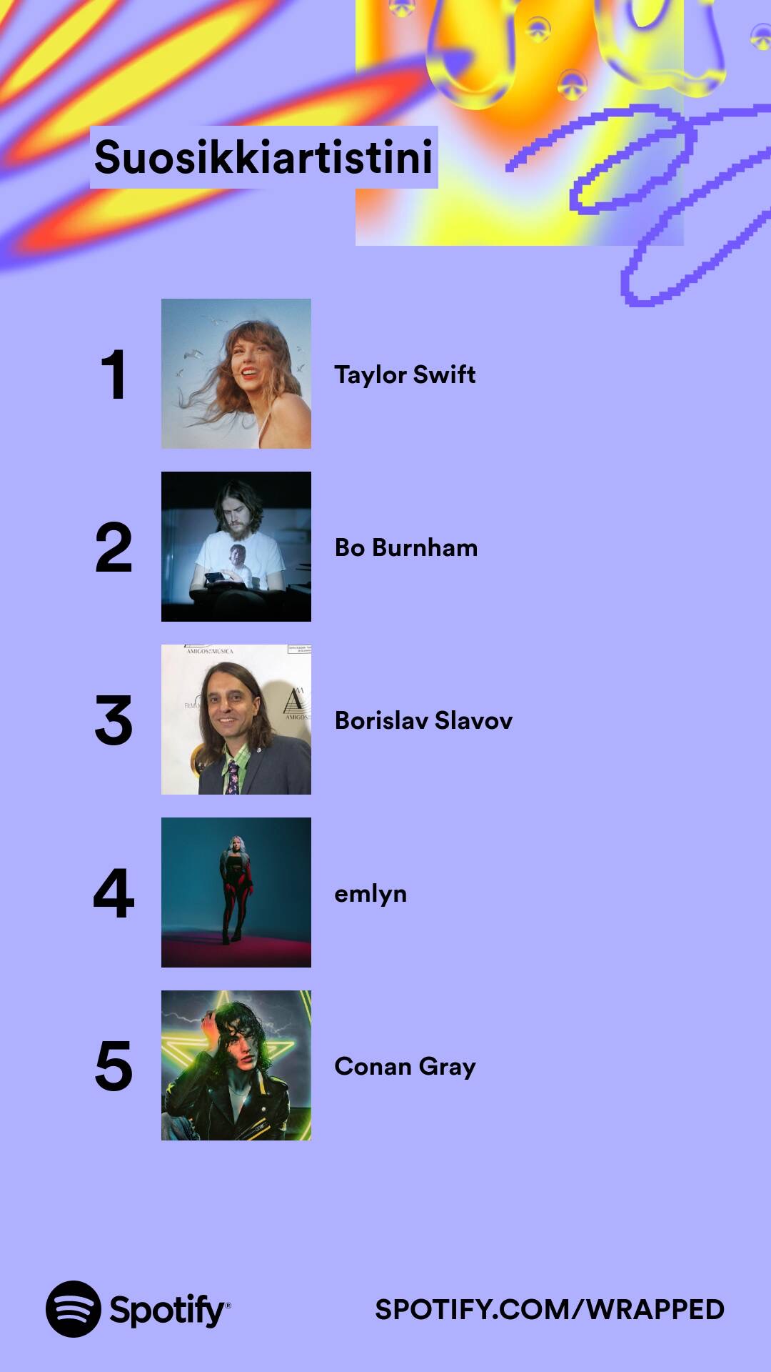 Nauroin ääneen, kun Spotify Wrapped kääntyi suosikkiartistini-näkymään. Pureskellaanpa siis: