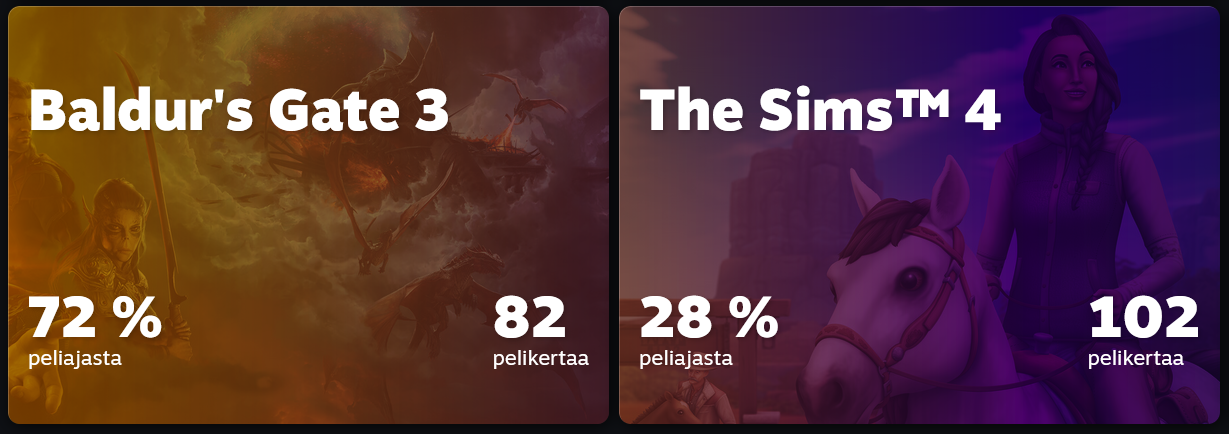 Olen aina ollut enemmän konsolipelaaja, ja Playstationin parissa vierähtikin tänä vuonna 296 tuntia. Lähes vastaaviin lukuihin pääsin kuitenkin myös tietokoneella ainoastaan Baldur’s Gate 3:n parissa, ja kun siihen laskee vielä päälle muutamat Sims-lanit, tulee videopelien parissa vierähtäneeksi aika mukava määrä tunteja.