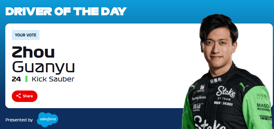 Maaliin saavutaan järjestyksessä 1. Verstappen, 2. Leclerc ja 3. Piastri. Zhou saa kauden ensimmäiset pisteet kahdeksannella sijalla- upea suoritus! Hänet palkitaan suorituksestaan Päivän kuljettaja -tunnustuksella.