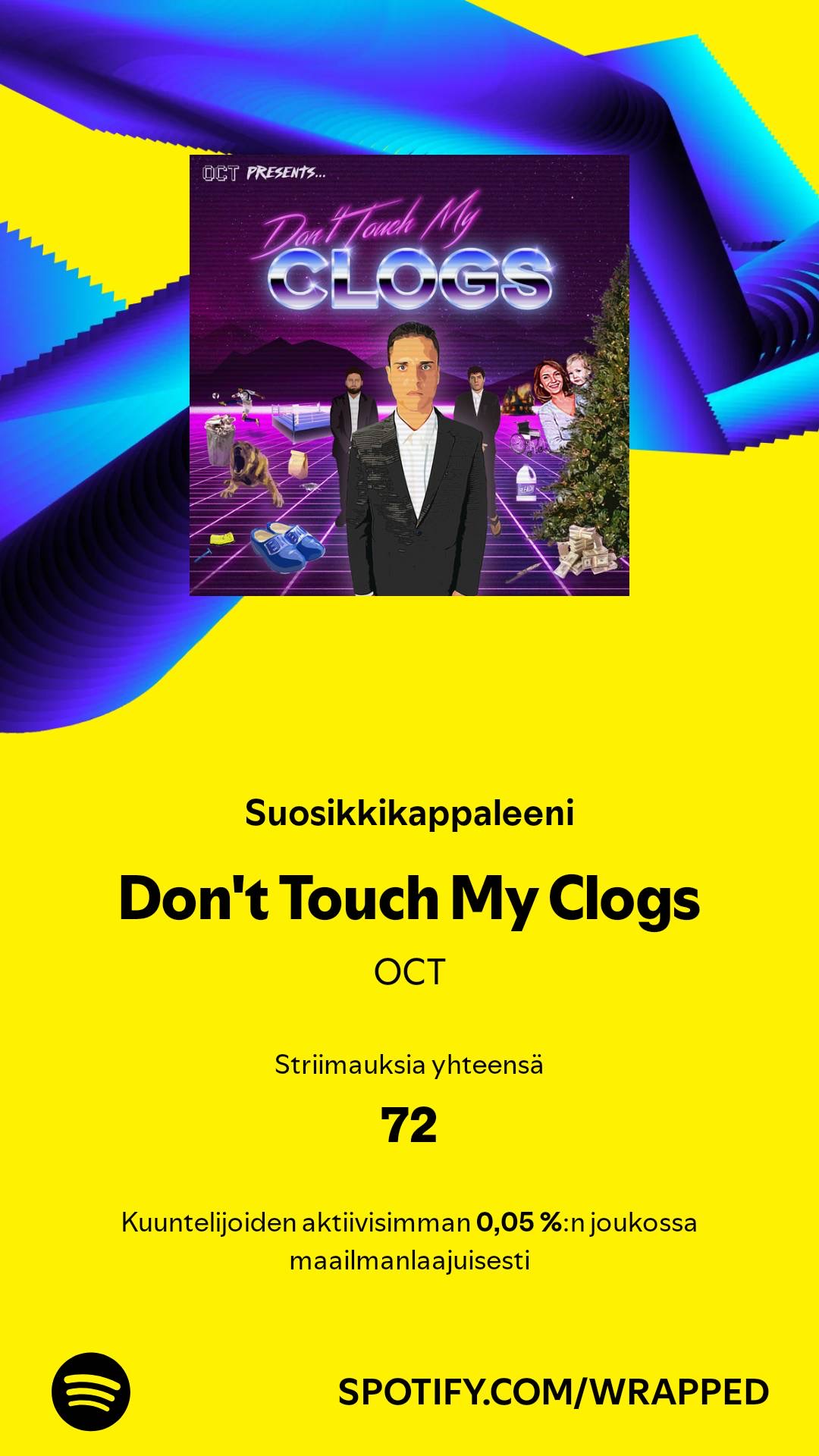 Minulle musiikissa kaikista tärkeintä ovat sanoitukset ja niiden herättämät tunnetilat, ja siksi onkin hupaisaa, että tänä vuonna kuunnelluin kappaleeni on kuunnelluin ainoastaan siksi, että se on vain niin bängeri biisi! Tiktok-viraalin OCT:n Don’t Touch My Clogs on puhdas komediabiisi, jossa on aivan liian koukuttava europop-biitti! Kappale tuli vuodenvaihteessa vastaan Tiktok-feedissäni, eikä se sen jälkeen ole lähtenyt Spotify-listoiltani. Kyllä, kappale kertoo intohimoisesta suhtautumisesta puukenkiin. Kyllä, se ansaitsee olla kuunnelluin kappaleeni tänä vuonna. Ei, en kadu mitään.