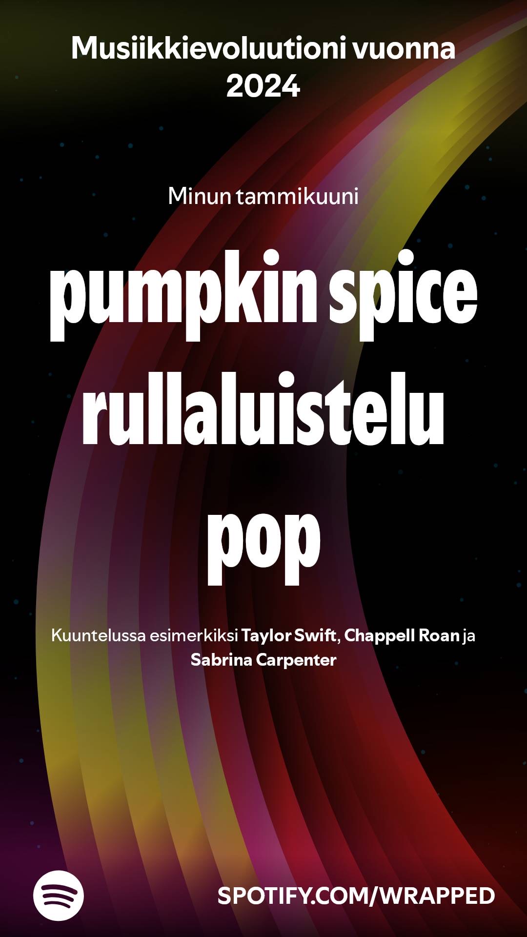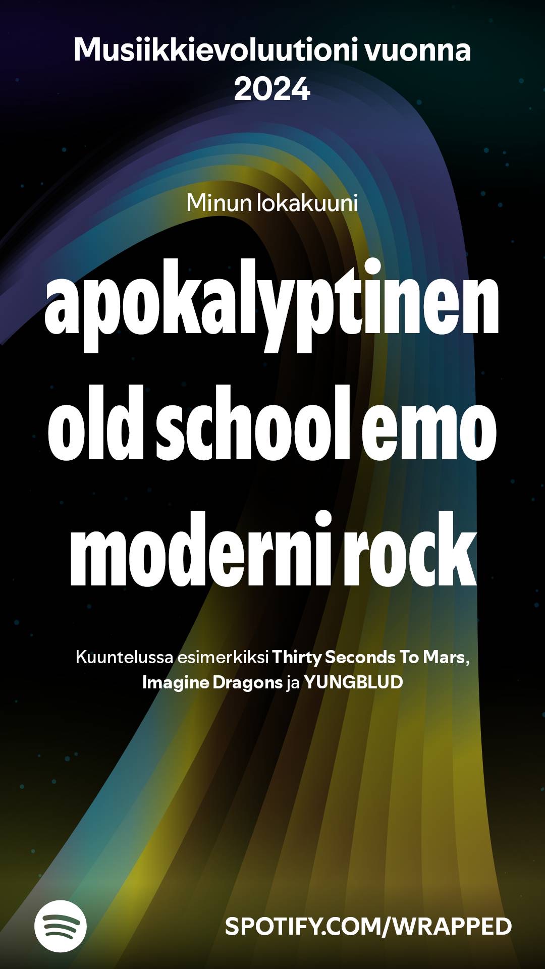 Tänä vuonna Spotify Wrapped ei tehnyt genre-hampurilaista, vaan Daylistien hengessä nimettyjä kokoavia kuukausikoosteita vuoden varrelta. Tämän vuoden musiikkimakuni (ja oikeastaan musiikkimakuni yleisesti) jakautuu mielestäni viiteen kategoriaan, josta Spotify Wrapped esittelee kolme (kuvissa):