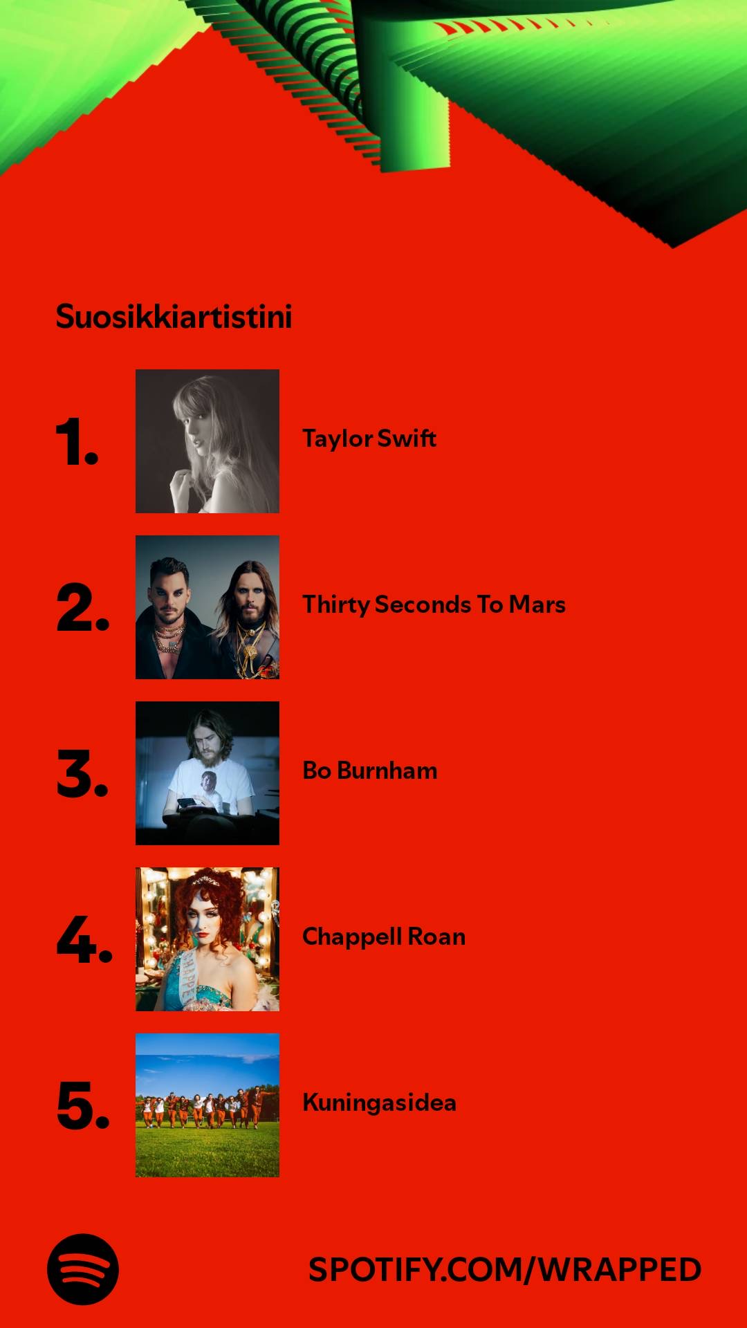 - Thirty Seconds to Mars on kaikkien aikojen suosikkibändini, mutta se ei ole moneen vuoteen yltänyt Wrapped-listoille. Tänä vuonna kävin pitkästä aikaa Marsien keikalla, joten kuuntelin etenkin uusinta levyä It’s the End of the World but It’s a Beautiful Day’ta keikkaa edeltävinä ja seuranneina viikkoina todella aktiivisesti. Viisi kappaletta tuolta levyltä pääsi TOP100 kuunnelluimmat-listalleni. Kuunnelluin kappale oli ihana Never not love you.