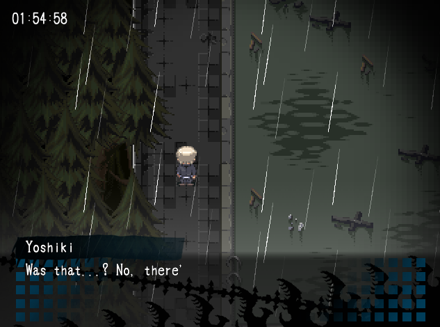 Palataan labraluokkaan: kaapuun verhoutunut hahmo lähtee liikkeelle, ja jahtaa Yoshikia ja Ayumia luokassa yhdessä Yoshikazun kanssa. Ayumi jää kiinni, mutta Yoshiki pelastaa hänet pinteestä kuollen valitettavasti itse sen seurauksena. Tämä tapahtuma käynnistää yhden Wrond end -poluista. Kun noin tuntia myöhemmin Wrong end -otsikko pamahtaa ruutuun, olen ikikiitollinen siitä, että minulla on tallessa tallennus juuri ennen Yoshikin kuolemaa.
