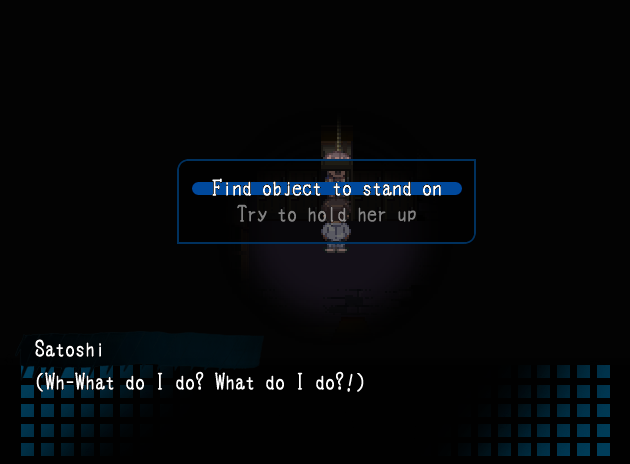 Satoshi suuntaa tyttöjen vessaan ja kuulee siellä Naomin ja Seikon jutustelun ääniä. Naomi ja Seiko eivät kuitenkaan jutustele vessassa, mutta Satoshi löytää kyllä surullisen tutusta vessakopista luokkatoverinsa hirttosilmukasta, tällä kertaa Naomin. Tämä on pelaajana nyt toinen vastaava tilanne, joten tällä kertaa paniikki ei ole niin vahva kuin Seikon kohdalla. Vaihtoehtoina on löytää esine, jonka päällä Naomi voisi yrittää seistä, tai nostaa Naomia ylöspäin, jotta tämä saisi happea. Satoshi ottaa Naomista kiinni ja nostaa tätä ylöspäin pidellen tätä olkapäillään – näin Satoshi saa löysättyä köyden Naomin kaulan ympäriltä ja pelastettua tämän hengen. Huh, olipa intensiivistä!