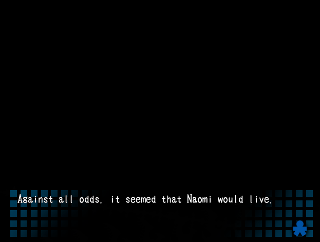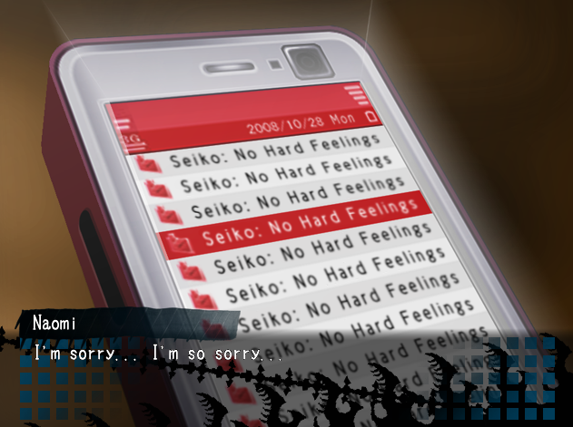 Pelillä on vielä yksi ässä hihassaan: Naomi haluaa kertoa Satoshille totuuden Seikon kuolemasta. Itkuinen Naomi kertoo, kuinka kirous otti hänestä vallan ja hän hirtti Seikon olematta ollenkaan tietoinen tekemisistään. Pelaaja näkee Naomin hylätyssä pommisuojassa television edessä, ja pimeys on ottamassa Naomista vallan. Sitten Naomin puhelin alkaa piipata, ja hän saa toistamiseen viestin Seikolta otsikolla ”No hard feelings”. Seikon viestit ajavat pimeyden ja epäröinnin pois Naomista ja antavat hänelle voimia voittaa pimeys. Naomi selvisi hengissä Seikon rakkauden voimalla.