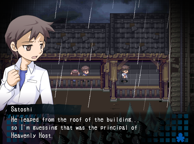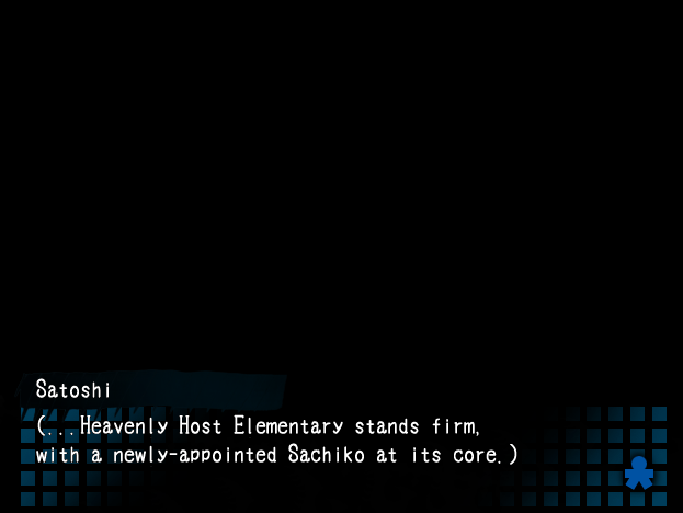 Palaamme Satoshin ja Naomin luo. Kaksikko keskustelee Sachiko-näköhavainnoistaan ja on hämmentynyt siitä, että joidenkin heidän löytämiensä vihjeiden mukaan Sachikon pitäisi olla elossa, mutta tämä on kuitenkin kummitus Heavenly Hostissa ja yksi sen murhien uhreista… Palapelin palat loksahtavat varmasti vielä yhteen. Satoshi ja Naomi päättävät etsiä Yukaa ja Sachikoa yhdessä. Maa järisee. Kattoparru putoaa Satoshin päälle.