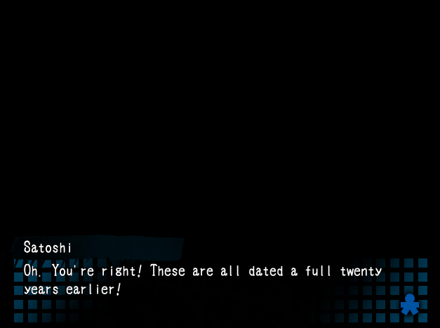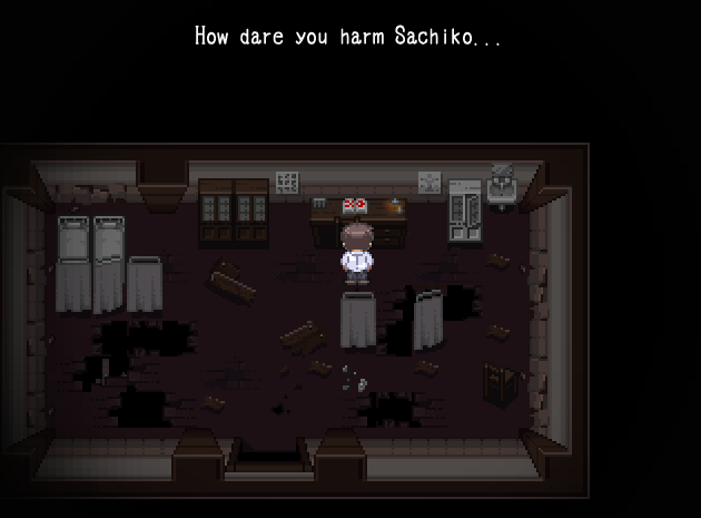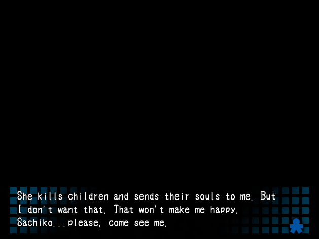 Satoshin on aika viedä patsaat paikalleen: niille on nimittäin paikka eräällä sivukäytävällä, ja patsaiden paikalleen laittaminen avaa uuden oven, jonka takaa paljastuu kapea ja pitkä käytävä. Naomille tulee paniikki, sillä hän aistii, että hänen kimppuunsa sairastuvalla käynyt tumma hahmo on jossain lähettyvillä. Myös Yukan päätä särkee, ja molempien tyttöjen nenistä vuotaa verta. Satoshi päättää mennä eteenpäin yksin. Käytävän päässä olevassa ovessa on lappu, jossa Sachikon äiti ohjeistaa odottamaan häntä tässä huoneessa sillä välin, kun äiti siivoaa. Naisen ääni toivottaa Satoshin tervetulleeksi sisään huoneeseen. Satoshin nenä alkaa vuotaa verta, mutta hän kokee, että hänen on mentävä huoneeseen sisään nähdäkseen jotain.