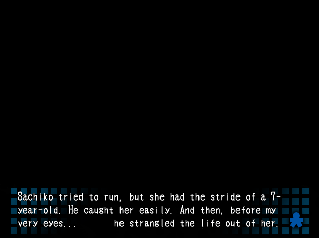 Yukan pissahätäsaaga jatkuu, ja kaksikko sopii, että Yuka menisi ulos metsän reunaan pissalle, ja Satoshi odottaisi eteisaulassa. Yuka kuitenkin kohtaa ulkokäytävällä yhden kummituksista, ja kun hän palaa eteisaulaan, Satoshi ei olekaan siellä. Surprised Pikachu-face. Yuka alkaa ymmärrettävästi parkua, mutta ryhdistäytyy sitten ja lähtee etsimään isoveljeään. Käytävillä kulkiessaan Yuka kuulee jälleen kameran äänen, ja löytää Morishigen kuvaamassa Mitsukin tuoretta ruumista. Ikävä tunnelma. Yuka kertoo Morishigelle joutuneensa eroon isoveljestään, ja Morishige lupaa auttaa etsimään Satoshin. Yuka kieltäytyy avusta, mutta Morishige ei hyväksy kieltäytymistä vastaukseksi… Yuka ottaa jalat alleen ja pakenee Morishigea.