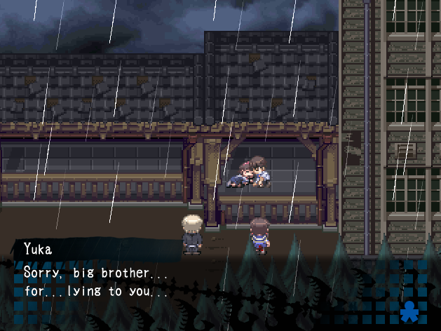 Familial bonds -lopun saavuttaminen oli hämmentävin pelikokemus, jonka olen kokenut videopelin parissa. Saavutin tämän lopun aiemmin mainitun wrong endin jälkeen ja olin todella hämmentynyt siitä, voiko tämä peli oikeasti päättyä näin – kunnes näin Steam-saavutuksen siitä, että kyseessä on vaihtoehtoinen loppu. Ero tämän ja true endingin välillä oli se, että Yuka pääsi viimein pissalle hylätyssä pommisuojassa. Kyllä, Yukan pissahätäsaagalla oli lopulta näin merkittävä vaikutus tässä pelissä – ja sillä oli myös oma body count.