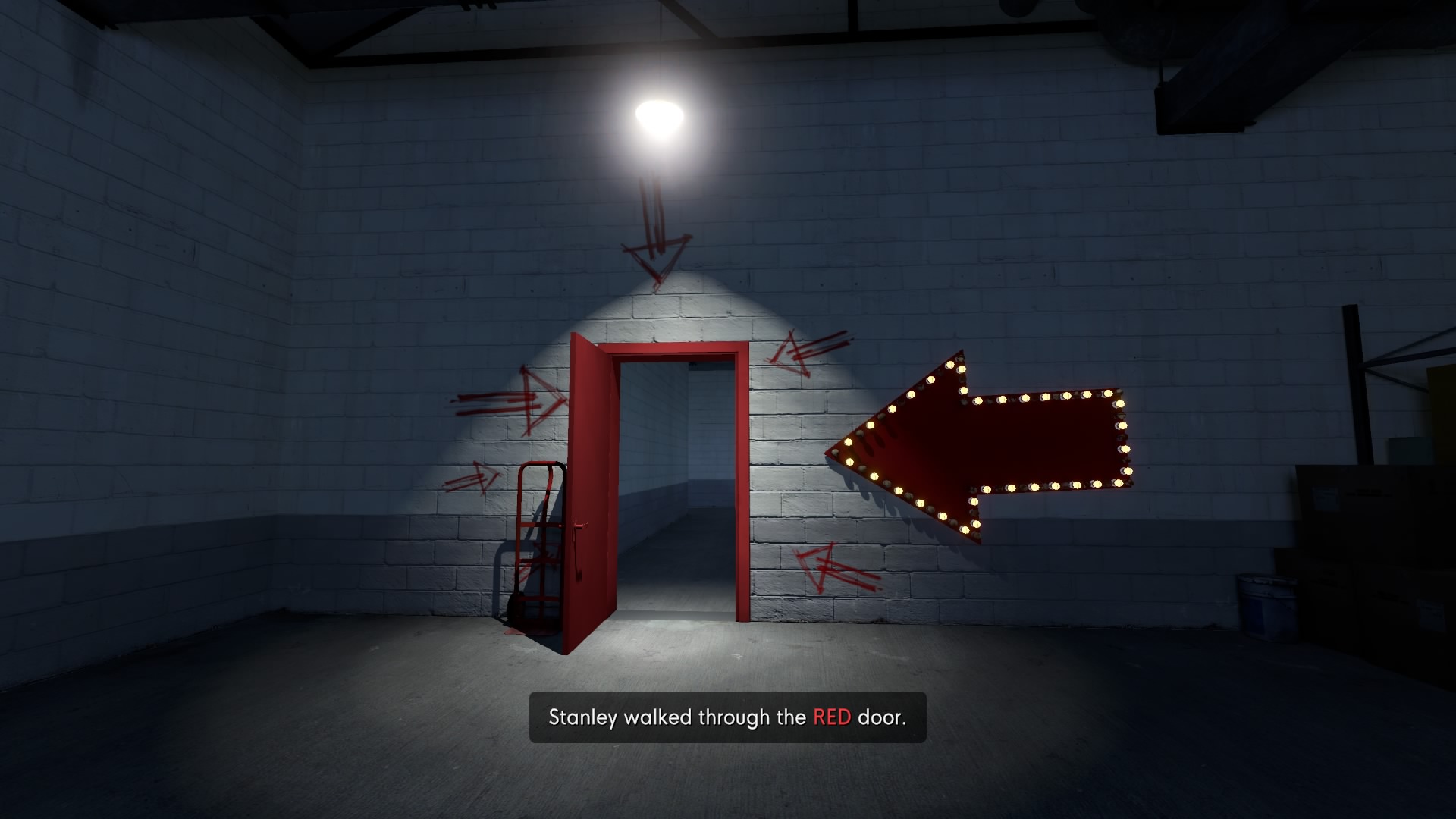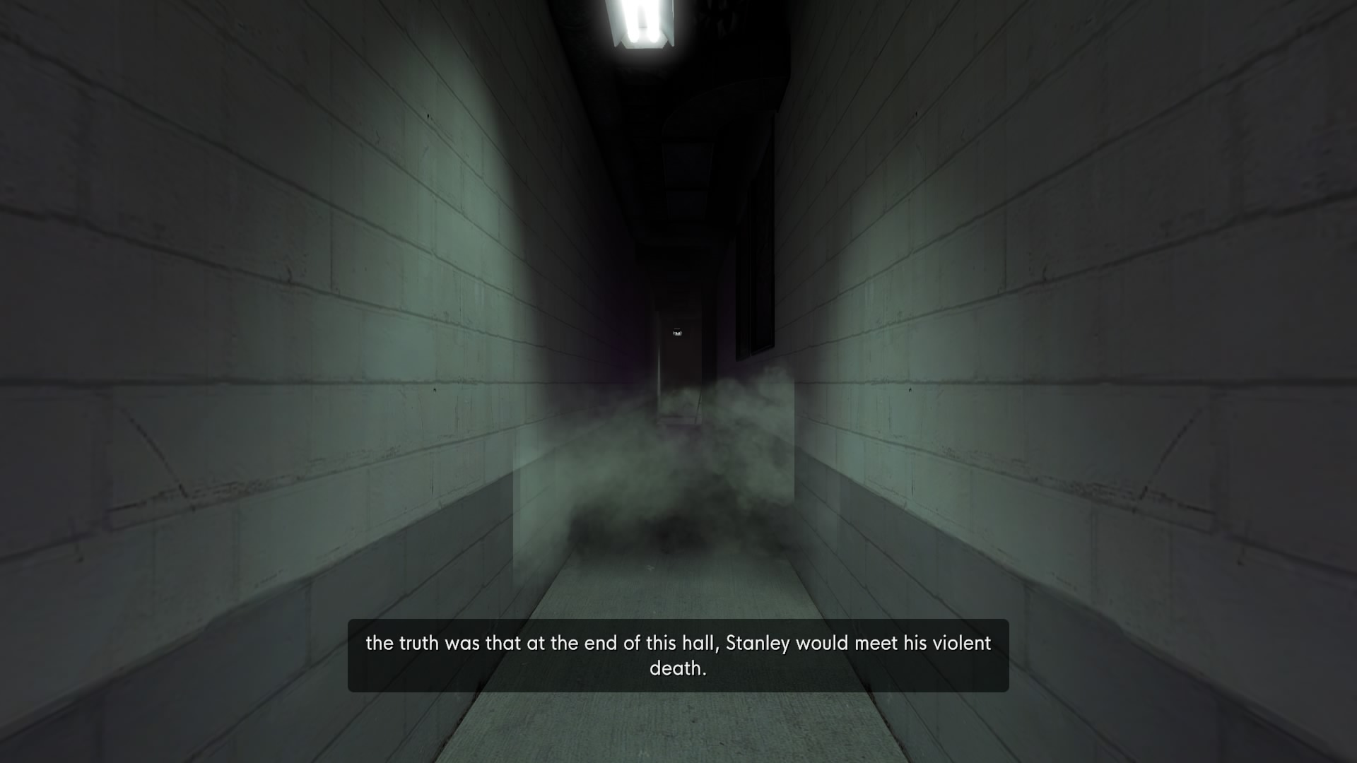 The Stanley Parable: Ultra Deluxessa oli muutama erityisen mieleenpainuva kohta. Kun Stanley löysi pomonsa työhuoneen yhteydestä piilotetun hissin ja laskeutui sillä toimiston alapuolella olevan mielenhallintalaitoksen eteen, hänellä on mahdollisuus uhmata Kertojaa ja olla jatkamatta kulkuaan eteenpäin. Sen sijaan Stanley voi seurata seinään punaisella kirjoitettua escape-tekstiä ja suunnata hämyiseen käytävään, jolloin Kertoja lausuu hyytävät sanat: ”[…] the truth was that at the end of this hall, Stanley would meet his violent death”. Pysähdyin oitis aloilleni ja arvostin tätä kutkuttavaa ja kammottavaa käännettä.