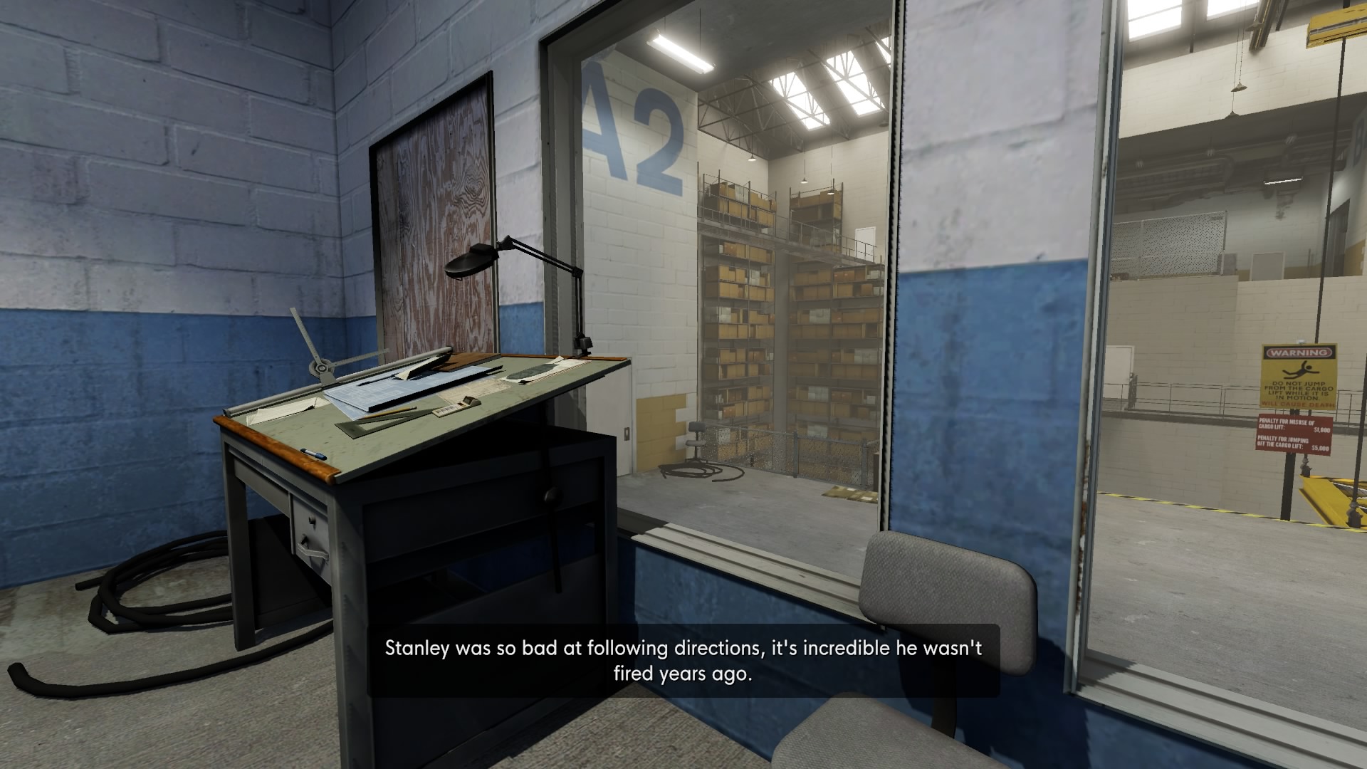 Toinen mieleenpainuva hetki oli tilanne, jossa Stanley on käynyt pomonsa työhuoneessa jo toistamiseen ja saanut avattua useasti salaisen kulkuväylän näpyttelemällä nelinumeroisen koodin pomon seinällä olevaan numeronäppäimistöön. Kun pelaaja suuntaa jälleen kerran pomon työhuoneeseen, kiusaus naputella numerokoodi näppäimistöön, ennen kuin Kertoja toistaa sen, on vahva, ja näin pelaaja myös tekee. Kertoja kuitenkin suuttuu tästä ja läksyttää pelaajaa kärsimättömyydestä – ja laittaa sitten rentouttavaa musiikkia, jotta pelaaja voisi päästä eroon ahdistuksestaan ja halustaan kiirehtiä videopelejä eteenpäin.