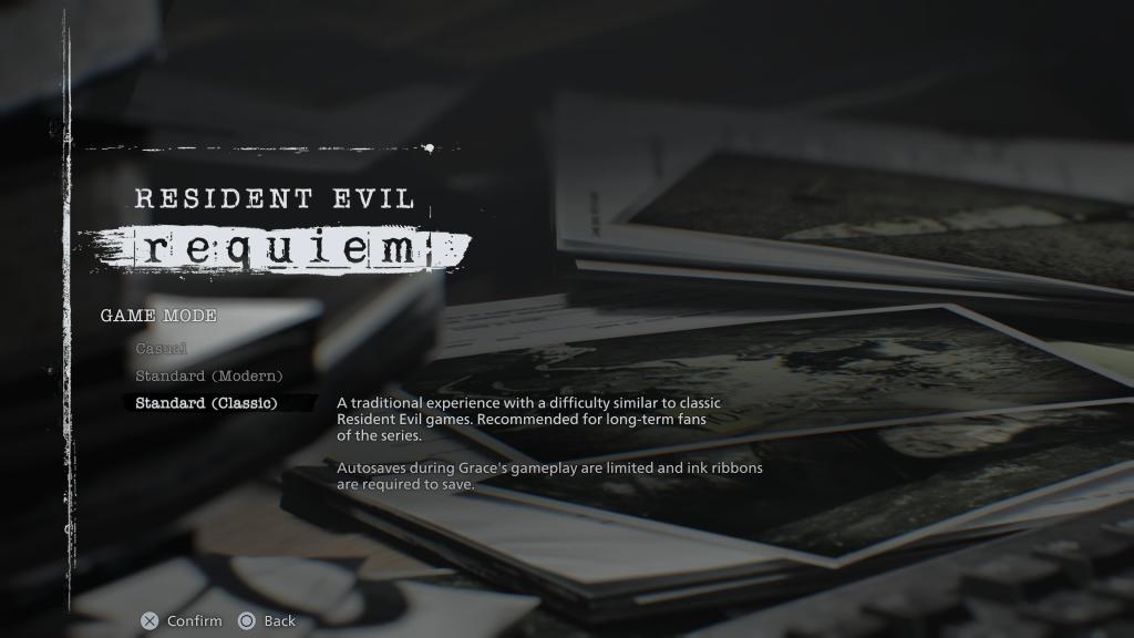 Pelasin Resident Evil Requiemin itse vaikeusasteella Standard (Classic), jota suositellaan pelisarjan pitkäaikaisille faneille. Olisin valinnut tämän vaikeustason jo tuon kuvauksen perusteella, mutta sitä seurannut teksti oli se, joka lukotti valintani: Gracen osuuksissa olisi käytössä ink ribbonit, joita klassisissa Resident Evil -peleissä käytetään pelin tallentamiseen pelistä löytyvien kirjoituskoneiden luona. Rajalliset mahdollisuudet tallentaa – ja jatkuvasti lisääntyvät mahdollisuudet menettää peliedistystä kuoleman korjatessa – ovat minulle Resident Evilien suola, jota olen kaivannut.